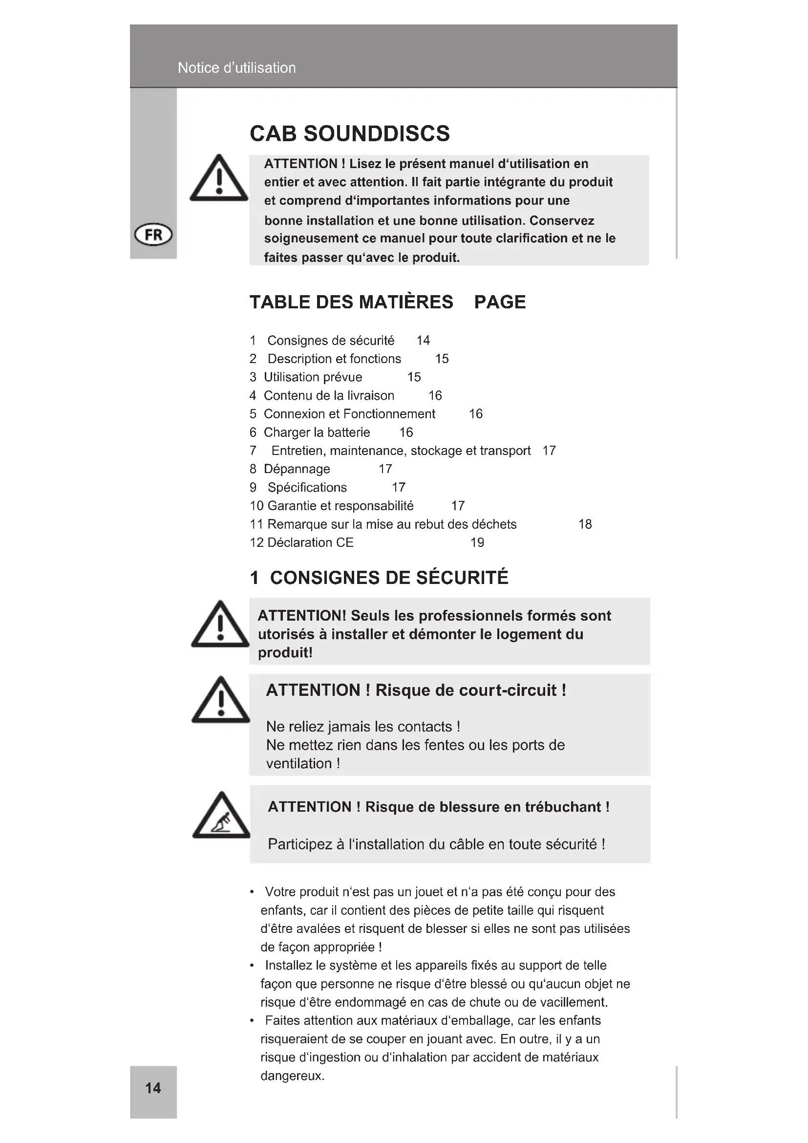 , a registered trademark oftheWentronicGmbHensures,thattheproductis conformedtothebasicstandardsanddirectives.Thesestandards canberequestedonlineonwww.cabstone.com.1314 Notice d’utilisation ATTENTION ! Lisez le présent manuel d‘utilisation en entier et avec attention. Il fait partie intégrante du produit et comprend d‘importantes informations pour une bonne installation et une bonne utilisation. Conservez soigneusement ce manuel pour toute clarication et ne le faites passer qu‘avec le produit. CAB SOUNDDISCS