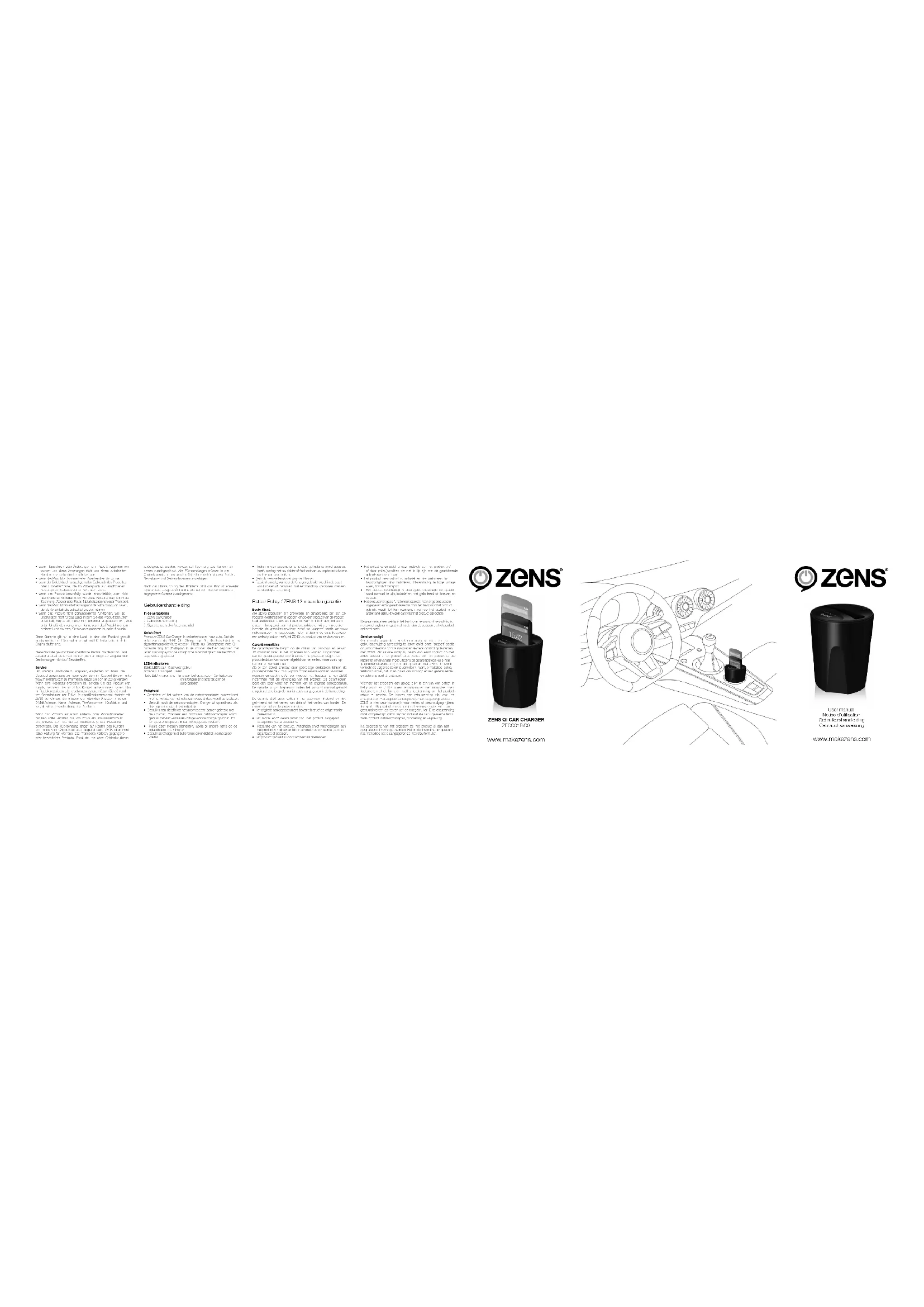 Démarrage rapide Placez votre chargeur de voiture ZENS dans le porte-gobelet de votre voiture. Branchez le câble sur le chargeur de voiture ZENS sur «IN». Insérez le câble dans la prise de votre allume-cigare/chargeur de voiture. Placez votre Smartphone avec soutien QI (écran jusqu’à 5” (12,7cm) dans le logement de chargement et commencez à charger. L’écran de votre smartphone doit faire face au côté où se trouve le logo ZENS. Indicateurs DEL Les deux DEL sont sur «ON» Prêt à être utilisé /chargé Le DEL vert clignote En charge Le DEL rouge clignote vite Aucune charge ne se produit et il y a une erreur. Veuillez vérifier votre smartphone et le remettre dans le chargeur de voiture. Notes importantes concernant la sécurité