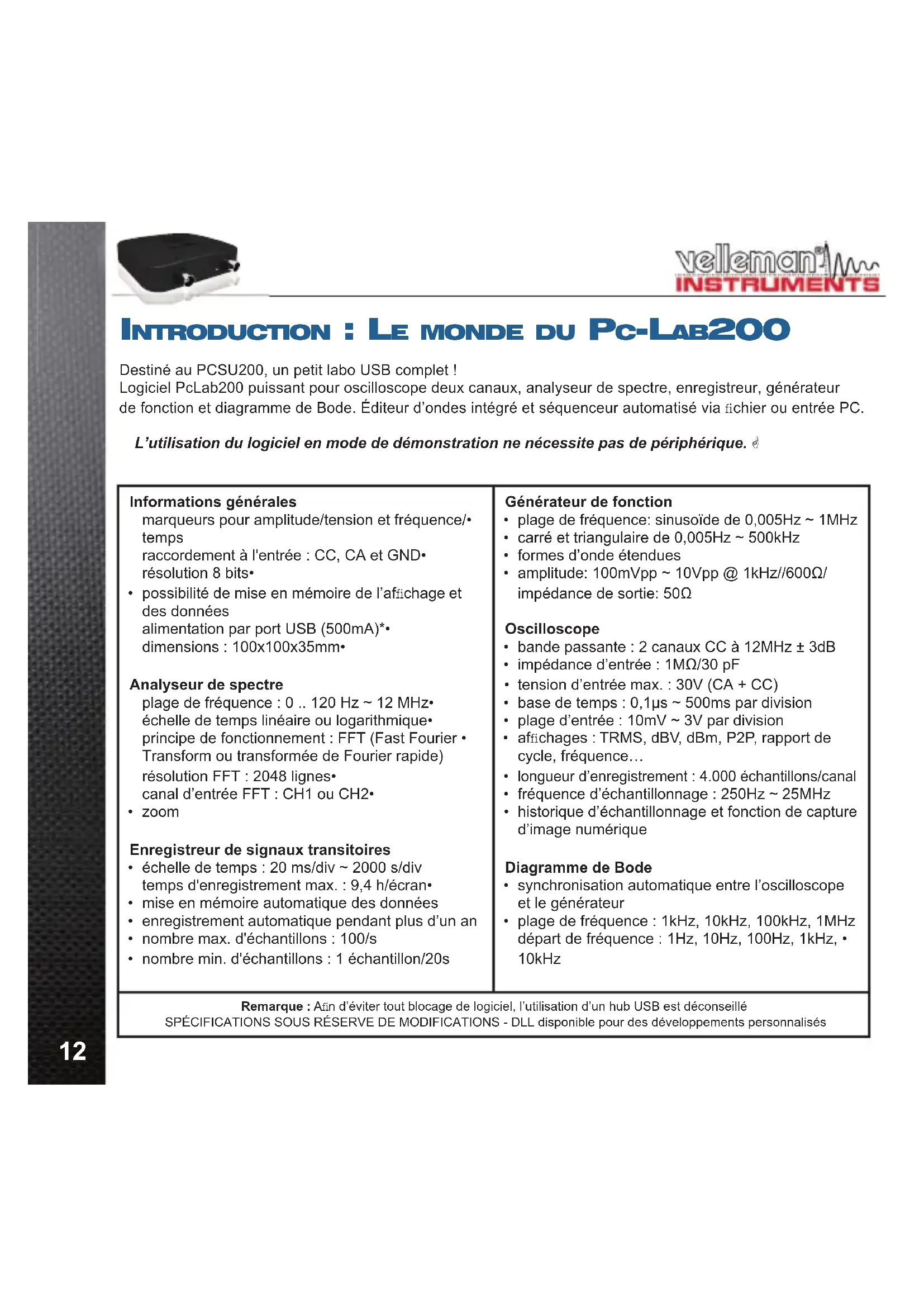 Destiné au PCSU200, un petit labo USB complet ! Logiciel PcLab200 puissant pour oscilloscope deux canaux, analyseur de spectre, enregistreur, générateur de fonction et diagramme de Bode. Éditeur d’ondes intégré et séquenceur automatisé via fi chier ou entrée PC. L’utilisation du logiciel en mode de démonstration ne nécessite pas de périphérique. Informations générales marqueurs pour amplitude/tension et fréquence/• temps raccordement à l'entrée : CC, CA et GND• résolution 8 bits• possibilité de mise en mémoire de l’affi chage et • des données alimentation par port USB (500mA)*• dimensions : 100x100x35mm• Analyseur de spectre plage de fréquence : 0 .. 120 Hz ~ 12 MHz• échelle de temps linéaire ou logarithmique• principe de fonctionnement : FFT (Fast Fourier • Transform ou transformée de Fourier rapide) résolution FFT : 2048 lignes• canal d’entrée FFT : CH1 ou CH2• zoom• Enregistreur de signaux transitoires échelle de temps : 20 ms/div ~ 2000 s/div• temps d'enregistrement max. : 9,4 h/écran• mise en mémoire automatique des données• enregistrement automatique pendant plus d’un an• nombre max. d'échantillons : 100/s• nombre min. d'échantillons : 1 échantillon/20s• Générateur de fonction plage de fréquence: sinusoïde de 0,005Hz ~ 1MHz• carré et triangulaire de 0,005Hz ~ 500kHz• formes d’onde étendues• amplitude: 100mVpp ~ 10Vpp @ 1kHz//600Ω/• impédance de sortie: 50Ω Oscilloscope bande passante : 2 canaux CC à 12MHz ± 3dB• impédance d’entrée : 1MΩ/30 pF• tension d’entrée max. : 30V (CA + CC)• base de temps : 0,1μs ~ 500ms par division• plage d’entrée : 10mV ~ 3V par division• affi chages : TRMS, dBV, dBm, P2P, rapport de • cycle, fréquence… longueur d’enregistrement : 4.000 échantillons/canal• fréquence d’échantillonnage : 250Hz ~ 25MHz• historique d’échantillonnage et fonction de capture • d’image numérique Diagramme de Bode synchronisation automatique entre l’oscilloscope • et le générateur plage de fréquence : 1kHz, 10kHz, 100kHz, 1MHz• départ de fréquence : 1Hz, 10Hz, 100Hz, 1kHz, • 10kHz Remarque : Afi n d’éviter tout blocage de logiciel, l’utilisation d’un hub USB est déconseillé SPÉCIFICATIONS SOUS RÉSERVE DE MODIFICATIONS - DLL disponible pour des développements personnalisés
