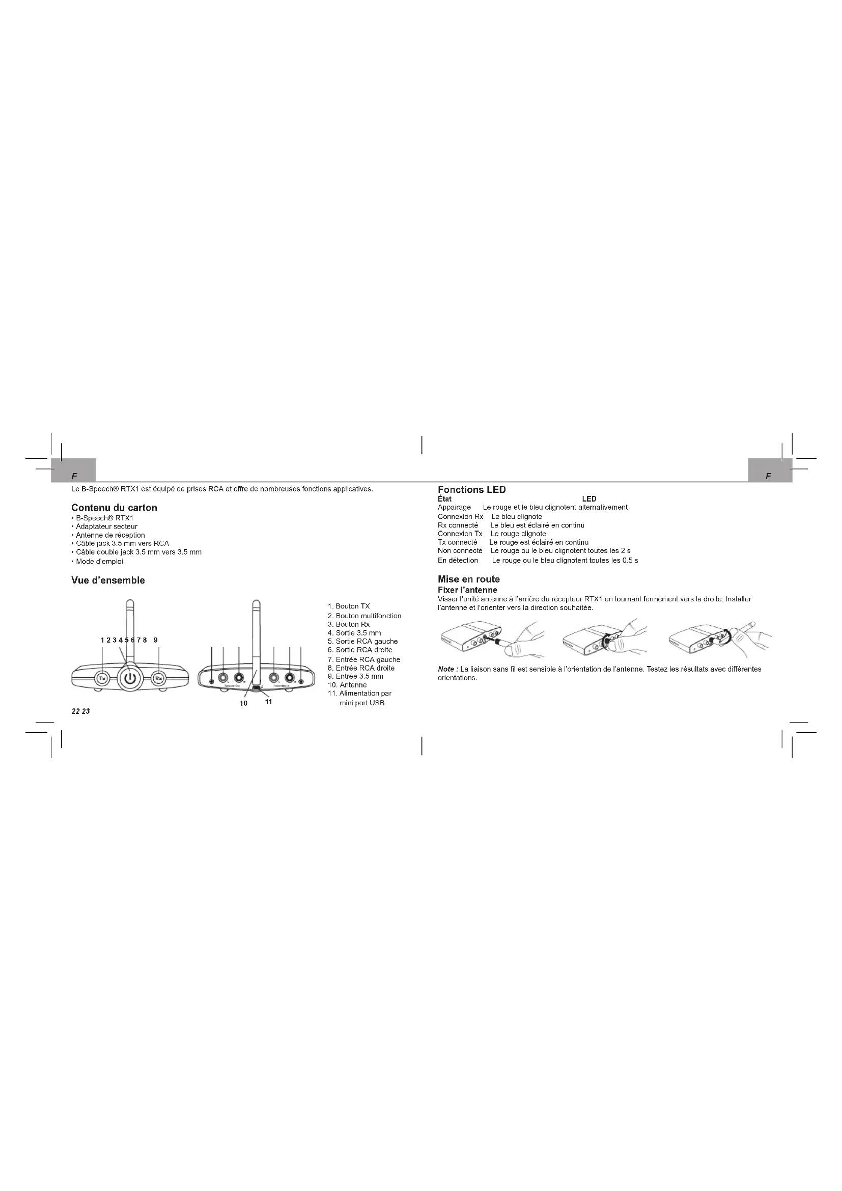 - Wir übernehmen keine Haftung für Verluste oder Beschädigungen während des Transports. Alle Reparaturarbeiten, die von unbefugten Dritten an unseren Produkten durchgeführt wird, lassen die Garantie nichtig werden. Falls Sie Technischen Support benötigen, kontaktieren Sie bitte unser Support-Team per E-Mail unter der Adresse service@b-speech.de. D F22 23 Fonctions LED État LED Appairage Le rouge et le bleu clignotent alternativement Connexion Rx Le bleu clignote Rx connecté Le bleu est éclairé en continu Connexion Tx Le rouge clignote Tx connecté Le rouge est éclairé en continu Non connecté Le rouge ou le bleu clignotent toutes les 2 s En détection Le rouge ou le bleu clignotent toutes les 0.5 s Mise en route Fixer l’antenne Visser l’unité antenne à l’arrière du récepteur RTX1 en tournant fermement vers la droite. Installer l’antenne et l’orienter vers la direction souhaitée. Note : La liaison sans l est sensible à l’orientation de l’antenne. Testez les résultats avec différentes orientations. Le B-Speech® RTX1 est équipé de prises RCA et offre de nombreuses fonctions applicatives. Contenu du carton
