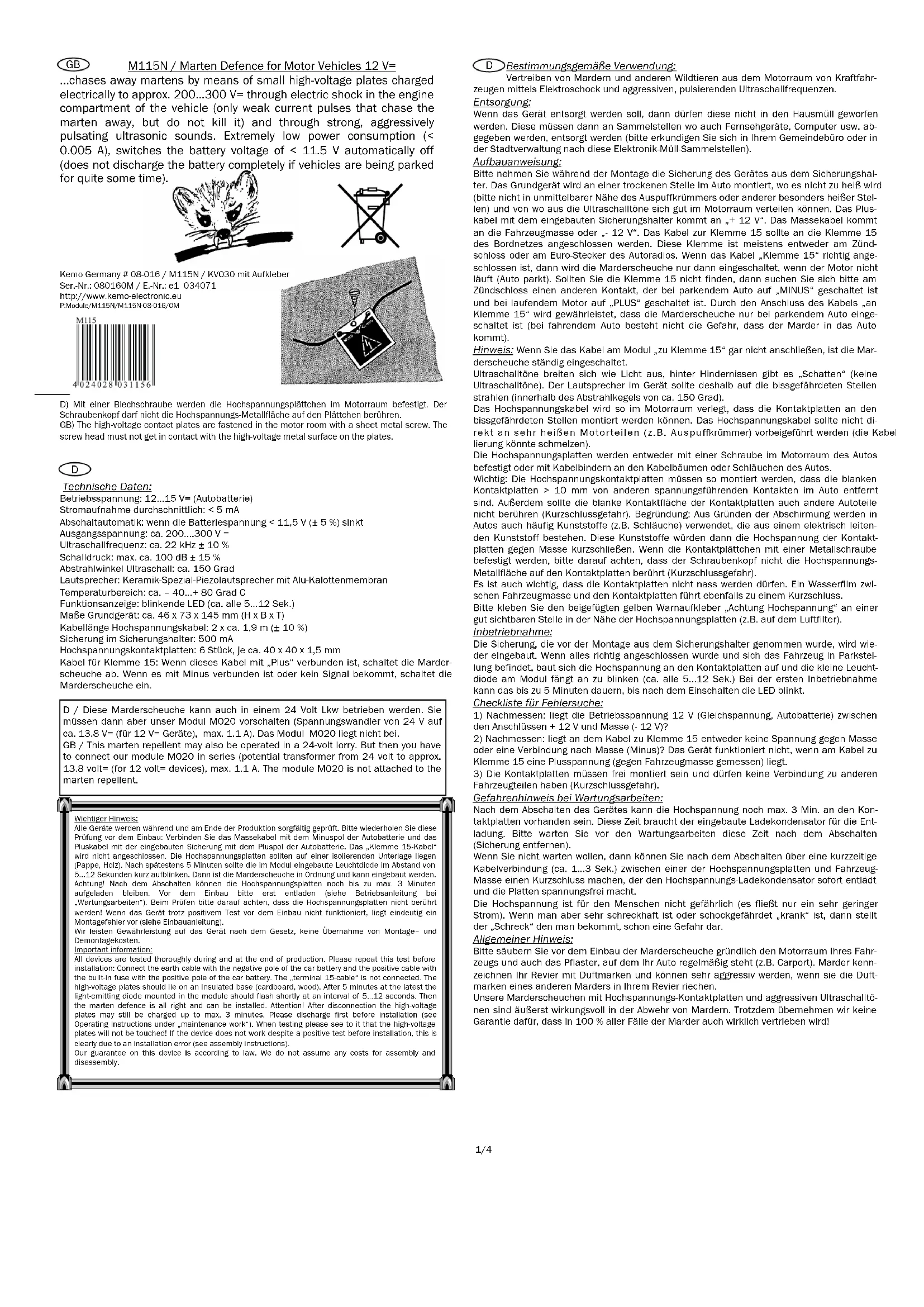 Waarschuwing voor gevaren bij onderhoudswerkzaamheden: Na het uitschakelen van het apparaat kan er gedurende 1 tot 3 min. (max. 3 min.) nog spanning staan op de contactplaten. Dit is de tijd die de ingebouwde condensator nodig heeft om te ontladen. Wacht na het uitschakelen gedurende deze tijd totdat u met de onderhoudswerkzaamheden begint (zekering verwijderen). Als u niet wilt wachten, dan kunt u na het uitschakelen kortsluiting maken met een kortdurende kabelverbinding (ca. 1 tot 3 sec.) tussen de hoogspanningsplaten en de voertuigmassa, die de hoogsspannings-condensator meteen ontlaadt en de platen spanningsvrij maakt. De hoogspanning is niet gevaarlijk voor mensen (er is slechts een zeer lage stroom). Als men echter snel schrikt of gevoelig is voor schokken kan de "schrik" die men krijgt wel gevaarlijk zijn. Algemene aanwijzing: De motorruimte van uw auto en de bestrating waarop uw auto regelmatig staat (bijv. carport) moeten voor montage grondig worden gereinigd. Marters kenmerken hun territorium met een geurvlag en kunnen erg agressief worden, als ze in hun territorium een geurvlag van een andere marter ruiken. Onze marterverjagers met hoogspannings-contactplaten en agressieve ultrasone tonen zijn zeer effectief in het afweren van marters. Toch kunnen we niet de garantie geven, dat in 100% van de gevallen de marter ook daadwerkelijk wordt verjaagd! Gebruik volgens de bestemming: Het verjagen van marters en andere wilde dieren uit de motorruimte van voertuigen met een elektrische schok en agressieve, pulserende ultrasone frequenties. Afvoer: Als het apparaat moet worden afgevoerd, mag deze niet bij het huisafval worden gegooid. Hij moet worden afgegeven bij een verzamelplaats voor elektronisch afval. Technische gegevens: Bedrijfsspanning: 12 tot 15 V = (voertuigaccu) Gemiddelde stroomopname: < 5 mA Automatisch uitschakelen: als de accuspanning daalt tot onder de 11,5 V (± 5 %) Uitgangsspanning: ca. 200 tot 300 V = Ultrasone frequentie: ca. 22 kHz ± 10 % Geluidsdruk: max. ca. 100 dB ± 15 % Stralingshoek ultrasone golven: ca. 150 graden Luidspreker: speciale keramische piëzo-luidspreker met aluminium tweetermembraan Temperatuurbereik: ca. - 40 tot + 80 graden C Functie-indicatie: knipperende LED (ca. om de 5 tot 12 sec.) Afmeting basisapparaat: ca. 46 x 73 x 145 mm (h x b x d) Lengte hoogspanningskabel: 2 x ca. 1,9m (± 10 %) Zekering in zekeringhouder: 500 mA Hoogspannings-contactplaten: 6 stuks, ca. 40 x 40 x 1,5 mm Kemo Germany # 08-016 / M115N / KV030 mit Aufkleber Ser.-Nr.: 08016OM / E.-Nr.: e1 034071 http://www.kemo-electronic.eu P:Module/M115N/M115N-08-016/OM FR: Indications de montage: Veillez ôter le fusible du porte-fusible de l'appareil avant de commencer le montage. L’appareil de base s’installe dans la voiture, dans un endroit sec et non exposé à de fortes chaleurs (ne pas le monter à proximité directe du coude d’échappement ni dans des zones particulièrement chaudes). Veillez à ce que sa disposition permette une répartition équilibrée des ultrasons dans le compartiment moteur. Le câble positif connecté au porte-fusible doit être relié à la borne positive + 12 V, le câble de mise à la masse est quant à lui relié à la masse du véhicule ou à la borne négative - 12 V. Le câble prévu à cet effet doit être relié à la borne 15 du réseau électrique de votre véhicule. Cette borne se situe en général sur la prise de contact ou sur la prise européenne de l'autoradio. Si le câble de la borne 15 est relié correctement, l’appareil anti-rongeurs se met en marche uniquement lorsque le moteur ne tourne pas (stationnement). Si vous ne trouviez pas la borne 15, veuillez chercher sur la serrure de contact un autre point de contact se positionnant sur « plus » lorsque la voiture est en stationnement et se positionnant sur « moins » ou n’étant pas sous tension lorsque le moteur tourne. La connexion du câble borne 15 garantit que le dispositif anti-rongeurs fonctionne uniquement lorsque le véhicule est en stationnement (aucun risque de présence de rongeurs lorsque la voiture roule). Remarque : si le câble n'est pas connecté au module de la borne 15, le dispositif anti-rongeurs est constamment en fonctionnement. La propagation des ondes ultrasons est semblable à la diffusion de la lumière – les obstacles entraînent la présence « d’ombres » (aucun ultrason perceptible). Il est donc nécessaire que les ultrasons émis par les haut-parleurs de l'appareil atteignent les zones menacées de morsures (dans un angle de rayonnement d’env. 150 degrés). Le câble haute tension est placé dans le compartiment moteur de telle manière que les plaques de contact puissent être montées au niveau des zones menacées par les rongeurs. Il ne doit en aucun cas se trouver à proximité directe des pièces très chaudes du moteur (par ex. du coude d’échappement) ; si c'est le cas, la gaine isolante du câble risque de fondre. Les plaques à haute tension peuvent être vissées dans le compartiment moteur ou fixées aux faisceaux de câbles ou aux durits à l’aide de fixes-câbles. Important: les plaques à haute tension doivent être montées de telle façon que les plaques porte-contact dénudées se trouvent à plus de 10 mm des autres points de contact sous tension présents dans la voiture. De même, ces surfaces dénudées ne doivent pas non plus entrer en contact avec d’autres pièces de la voiture (risque de court-circuit). Motif : afin de permettre l’évacuation de l’électricité statique de la voiture, des pièces plastiques (par ex. des durits) fabriquées en matière synthétique conductrice sont fréquemment utilisées. Si elles touchent les plaques de contact, ces pièces entraînent le court- circuit de la haute tension avec la masse. Si les plaques de contact sont fixées à l’aide d’une vis métallique, veuillez vous assurer que la tête de vis ne touche pas leur surface métallique mise sous haute tension (