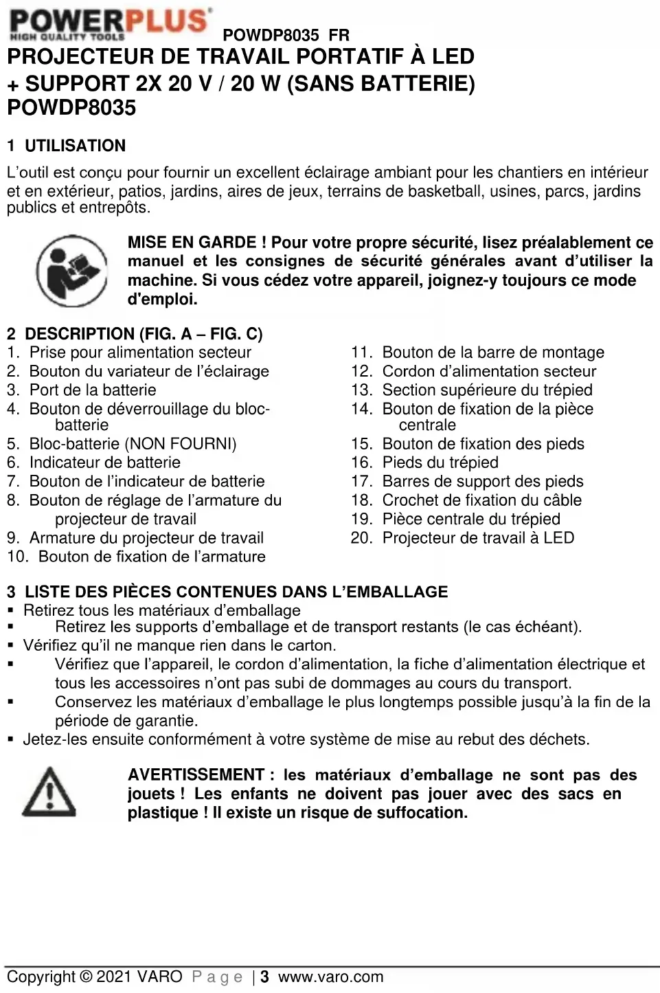 jouets ! Les enfants ne doivent pas jouer avec des sacs en plastique ! Il existe un risque de suffocation.POWDP8035 FR Copyright © 2021 VARO P a g e | 4 www.varo.com 2 x projecteurs de travail à LED 1 x trépied 1 x barre de montage 1 x câble de jonction 3 x boutons de fixation 3 x rondelles 2 x écrous à oreilles 1 x manuel 4 PICTOGRAMMES Les symboles suivants sont utilisés dans ce mode d’emploi et/ou sur la machine :