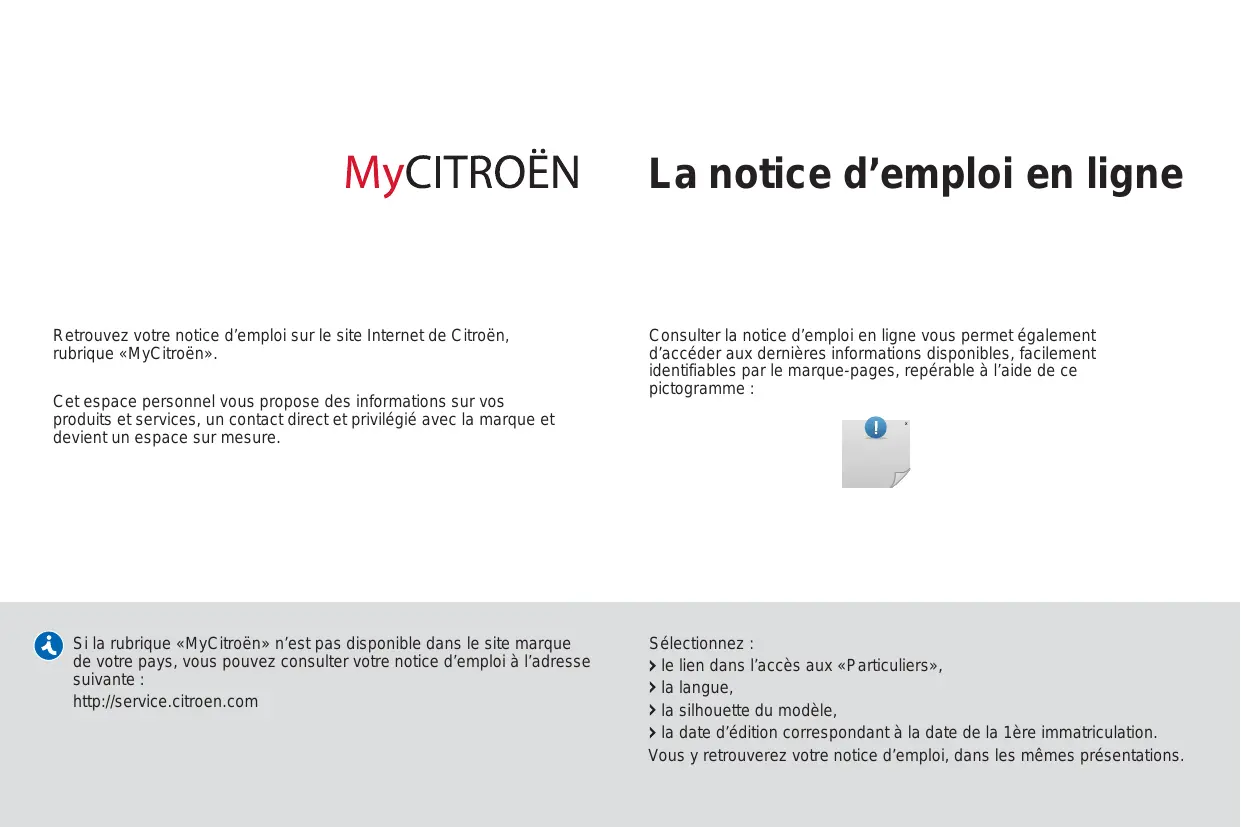 La notice d’emploi en ligne Retrouvez votre notice d’emploi sur le site Internet de Citroën, rubrique «MyCitroën». Cet espace personnel vous propose des informations sur vos produits et services, un contact direct et privilégié avec la marque et devient un espace sur mesure. Si la rubrique «MyCitroën» n’est pas disponible dans le site marque de votre pays, vous pouvez consulter votre notice d’emploi à l’adresse suivante : http://service.citroen.com Consulter la notice d’emploi en ligne vous permet également d’accéder aux dernières informations disponibles, facilement identifiables par le marque-pages, repérable à l’aide de ce pictogramme : Sélectionnez : le lien dans l’accès aux «Particuliers», la langue, la silhouette du modèle, la date d’édition correspondant à la date de la 1ère immatriculation. Vous y retrouverez votre notice d’emploi, dans les mêmes présentations. Nous attirons votre attention... Votre véhicule reprend une partie des équipements décrits dans ce document, en fonction du niveau de finition, de la version et des caractéristiques propres au pays de commercialisation. La pose d’un équipement ou d’un accessoire électrique non référencé par Citroën, peut entraîner une panne du système électronique de votre véhicule. Veuillez noter cette particularité et prendre contact avec un représentant de la marque Citroën pour vous faire présenter les équipements et accessoires référencés. Citroën présente, sur tous les continents, une gamme riche, alliant technologie et esprit d’innovation permanent, pour une approche moderne et créative de la mobilité. Nous vous remercions et vous félicitons de votre choix. Au volant de votre nouveau véhicule, connaître chaque équipement, chaque commande, chaque réglage, rend plus confortable et plus agréable vos déplacements, vos voyages. Bonne Route ! Sommaire Sommaire Légende