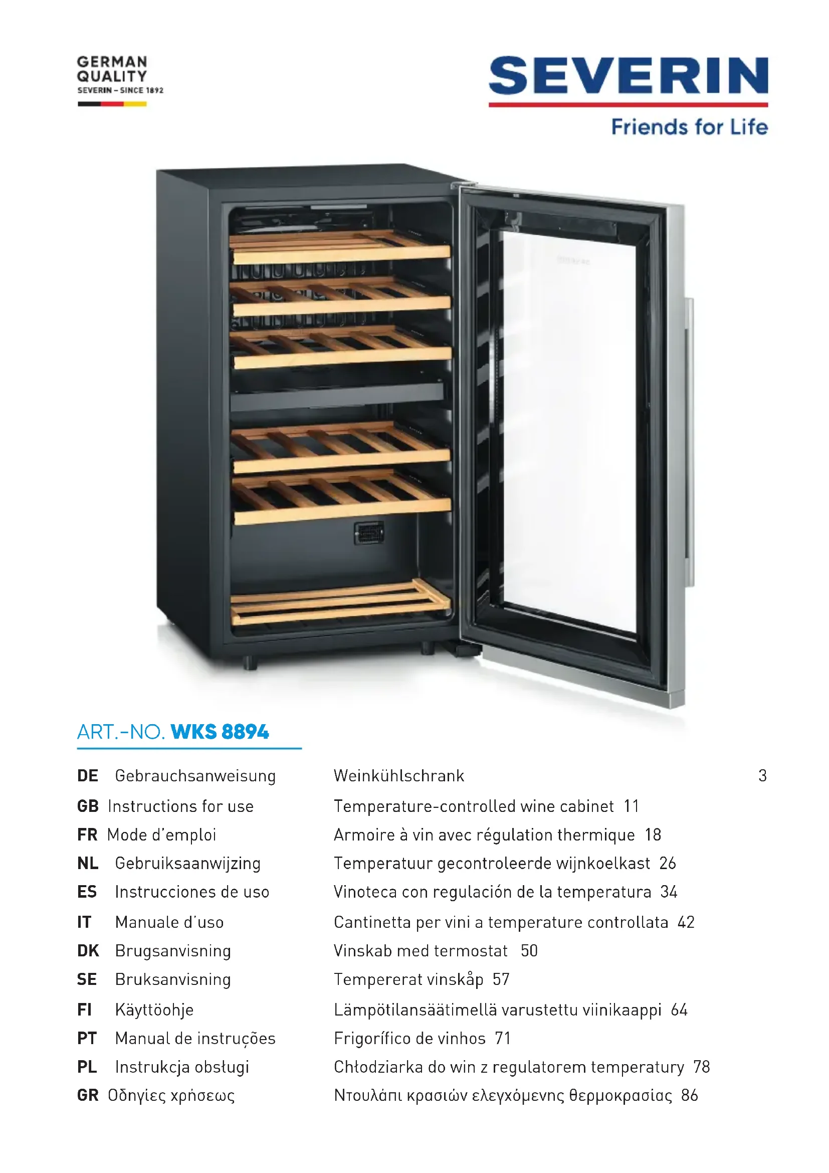 Les appareils marqués avec ce symbole doivent être éliminés séparément des ordures domestiques. Ces appareils contiennent des ressources précieuses qui peuvent être recyclées. Une élimination correcte protège l’environnement et la santé de tous peut. Votre distributeur peut vous informer sur l’élimination correcte. ∙ Retirez la che secteur de la prise et déconnectez le cordon d’alimentation de l’appareil avant l’élimination de l’appareil. Démontez la porte, de telle sorte que personne ne puisse s’y enfermer accidentellement, par ex. des enfants en jouant. ∙ L’agent réfrigérant isobutane (R600a) et le gaz propulseur cyclopentane (C5H10) dans l’isolation sont des substances inammables et doivent par conséquent être éliminés de manière adéquate. ∙ Assurez-vous de ne pas endommager les tuyaux du circuit de refroidissement avant d’avoir procédé intégralement à la mise au rebut de l’appareil. Garantie Cet appareil est garanti par le fabricant pendant une durée de deux ans à partir de la date d‘achat, contre tous défauts de matière et vices de fabrication. Au cours de cette période, toute pièce défectueuse sera remplacée gratuitement. Cette garantie ne couvre pas l‘usure normale de l‘appareil, les pièces cassables telles que du verre, des ampoules, etc., ni les détériorations provoquées par une mauvaise utilisation et le non-respect du mode d‘emploi. Aucune garantie ne sera due si l‘appareil a fait l‘objet d‘une intervention à titre de réparation ou d‘entretien par des personnes non-agréées par nous-mêmes. Cette garantie n‘affecte pas les droits légaux des consommateurs sous les lois nationales applicables en vigueur, ni les droits du consommateur face au revendeur résultant du contrat de vente/d‘achat. Si votre appareil ne fonctionne plus normalement, veuillez l‘adresser, sous emballage solide, à une de nos stations de service après-vente agréées, muni de votre nom et adresse. Si vous retournez votre appareil pendant la période de garantie, n‘oubliez pas de joindre à votre envoi la preuve de garantie (ticket de caisse, facture etc.) certiée par le vendeur.25 142 x 208 mm Fiche technique Référence du modèle WKS 8894 Type d’appareil de réfrigération : Appareil à faible niveau de bruit : non Type de construction : à pose libre Appareil de stockage du vin : oui Autre appareil de réfrigération : non Dimensions hors tout (H x L x P en mm) 850 x 480 x 430 Volume total (en l) 80 IEE 188 Classe d’efcacité énergétique G Consommation d’énergie annuelle (en kWh/a)* 152 Classe d’émission de bruit acoustique dans l’air C Émissions de bruit acoustique dans l’air (en dB(A) re 1pW) 41 Classe climatique N, ST Température ambiante (en °C) 16-38 Temps de stockage en cas de dysfonctionnement (en h) - Poids (en kg) 31,2 Réglage hiver non Paramètres des compartiments : Type Volume (en l) Réglage de température recommandé (in°C) Pouvoir de congélation spécique (kg/24h) Mode de dégivrage A = automatique M = manuel Dispositif de congélation rapide Compartiment de stockage du vin 80 12 - A - Pour les armoires à vin Nombre de bouteilles de vin standard 28 Paramètres de la source lumineuse : Type de source lumineuse LED Classe d’efcacité énergétique - Données électriques voir plaque signalétique *) La consommation réelle dépend de l’utilisation et de l’emplacement de l’appareil. Informations à fournir au Service Clientèle Si une réparation de l’appareil s’avère nécessaire, veuillez contacter notre Service Clientèle, en leur fournissant un résumé détaillé du défaut et le numéro d’article WKS ... gurant sur la plaque signalétique de l’appareil. Ces informations nous permettront de traiter votre demande de manière efcace. En cas de mauvais fonctionnement ou autres problèmes, ou pour commander des pièces de rechange, veuillez contacter notre Service Clientèle.26 142 x 208 mm Temperatuur gecontroleerde wijnkoelkast Geachte klant, Voordat het apparaat gebruikt wordt, de volgende instructies goed doorlezen en deze handleiding bewaren voor toekomstige raadpleging. Dit apparaat mag alleen gebruikt worden door personen die bekend zijn met de gebruiksaanwijzing. Aansluiting op het lichtnet ∙ Dit apparaat mag alleen worden aangesloten op een, volgens de voorschriften geïnstalleerd, geaard veiligheidsstopcontact. Zorg ervoor dat de op het typeplaatje aangegeven spanning overeenkomt met de netspanning. Dit product komt overeen met de richtlijnen aangegeven op het CE-label. ∙ Gebruik dit apparaat nooit met een transformator of, samen met andere elektrische apparaten, op een verlengsnoer. ∙ Om vibratie geluiden te voorkomen, ervoor zorgen dat het snoer geen andere delen van de achterkant van het apparaat aanraakt. (b.v. de warmtewisselaar). Algemene informatie ∙ Dit apparaat is een compressor koeling ontworpen voor het koelen en opbergen van wijn. ∙ Koelingsapparaten zijn geclassiceerd in verschillende klimaat klassen. De klimaatklasse voor dit apparaat vindt u in de apparaatgegevens aan het einde van de handleiding. ∙ Wordt dit apparaat op een verkeerde manier gebruikt of worden de veiligheidsregels niet gevolgt, dan kan de fabrikant niet aansprakelijk worden gesteld voor eventuele schades. Belangrijke veiligheidsaanwijzingen ∙ Dit apparaat is bestemd voor huishoudelijk of gelijkwaardig gebruik, zoals - in bedrijfskeukens, in winkels, kantoren of andere bedrijfsruimtes, - in agrarische instellingen, - door klanten in hotels, motels enz. en gelijkwaardige accommodaties, - in bed and breakfast gasthuizen. ∙ Dit apparaat is niet geschikt voor commercieel gebruik, evenmin voor gebruik in een catering bedrijf en gelijkwaardige groothandels.
