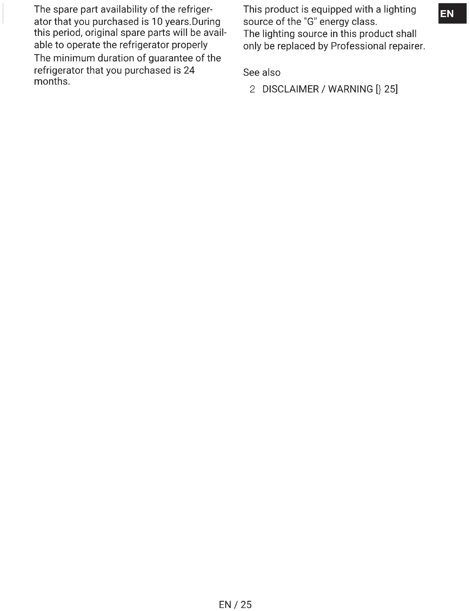 SKFR / 50 chées de ce produit selon les méthodes dé- crites dans les actes législatifs en applica- tion de la directive 2009/125/CE Toutefois, seul l’agent de service (c’est- à-dire les réparateurs professionnels agréés) que vous pouvez joindre au nu- méro de téléphone indiqué dans le ma- nuel d’utilisation/la carte de garantie ou par l’intermédiaire de votre fournisseur agréé peut fournir un service conformé- ment aux conditions de garantie. Par conséquent, veuillez noter que les répa- rations effectuées par des réparateurs professionnels (qui ne sont pas autori- sés par) Beko Marka annulent la garan- tie. Auto-réparation L’auto-réparation peut être effectuée par l’utilisateur final en ce qui concerne les pièces de rechange suivantes: poignées de porte, charnières de porte, plateaux, paniers et joints de porte (une liste mise à jour est également disponible sur support.beko.com à partir du 1er mars2021). En outre, pour garantir la sécurité du pro- duit et éviter tout risque de blessure grave, ladite auto-réparation doit être effectuée en suivant les instructions du manuel d’utilisa- tion pour l’auto-réparation ou celles dispo- nibles sur support.beko.com . Pour votre sécurité, débranchez le produit avant de procéder à toute auto-réparation. Les réparations et tentatives de réparation par les utilisateurs finaux pour des pièces ne figurant pas dans cette liste et/ou ne suivant pas les instructions des manuels d’utilisation pour l’auto-réparation ou celles disponibles sur support.beko.com, pour- raient donner lieu à des problèmes de sécu- rité non imputables à Beko, et annuleront la garantie du produit. Il est donc fortement recommandé aux utili- sateurs finaux de s’abstenir de tenter d’ef- fectuer des réparations ne figurant pas sur la liste des pièces de rechange mentionnée, mais de contacter dans de tels cas des ré- parateurs professionnels autorisés ou des réparateurs professionnels agréés. Au contraire, de telles tentatives de la part des utilisateurs finaux peuvent causer des pro- blèmes de sécurité et endommager le pro- duit et, par la suite, provoquer un incendie, une inondation, une électrocution et des blessures corporelles graves. À titre d’exemple, mais sans s’y limiter, vous devez vous adresser à des répara- teurs professionnels autorisés ou à des ré- parateurs professionnels agréés pour les réparations suivantes: compresseur, circuit de refroidissement, carte mère, carte d’in- verseur, panneau d’affichage, etc. Le fabricant/vendeur ne peut être tenu res- ponsable dans tous les cas où les utilisa- teurs finaux ne se conforment pas à ce qui précède. La disponibilité des pièces de rechange du réfrigérateur que vous avez acheté est de 10 ans. Pendant cette période, les pièces de rechange d'origine seront disponibles pour faire fonctionner le réfrigérateur cor- rectement. La durée minimale de garantie du réfrigéra- teur que vous avez acheté est de 24mois. Cet appareil est équipé d’une source d’éclairage de classe énergétique «G». La source d’éclairage de cet appareil ne doit être remplacée que par des répara- teurs professionnels. Voir aussi