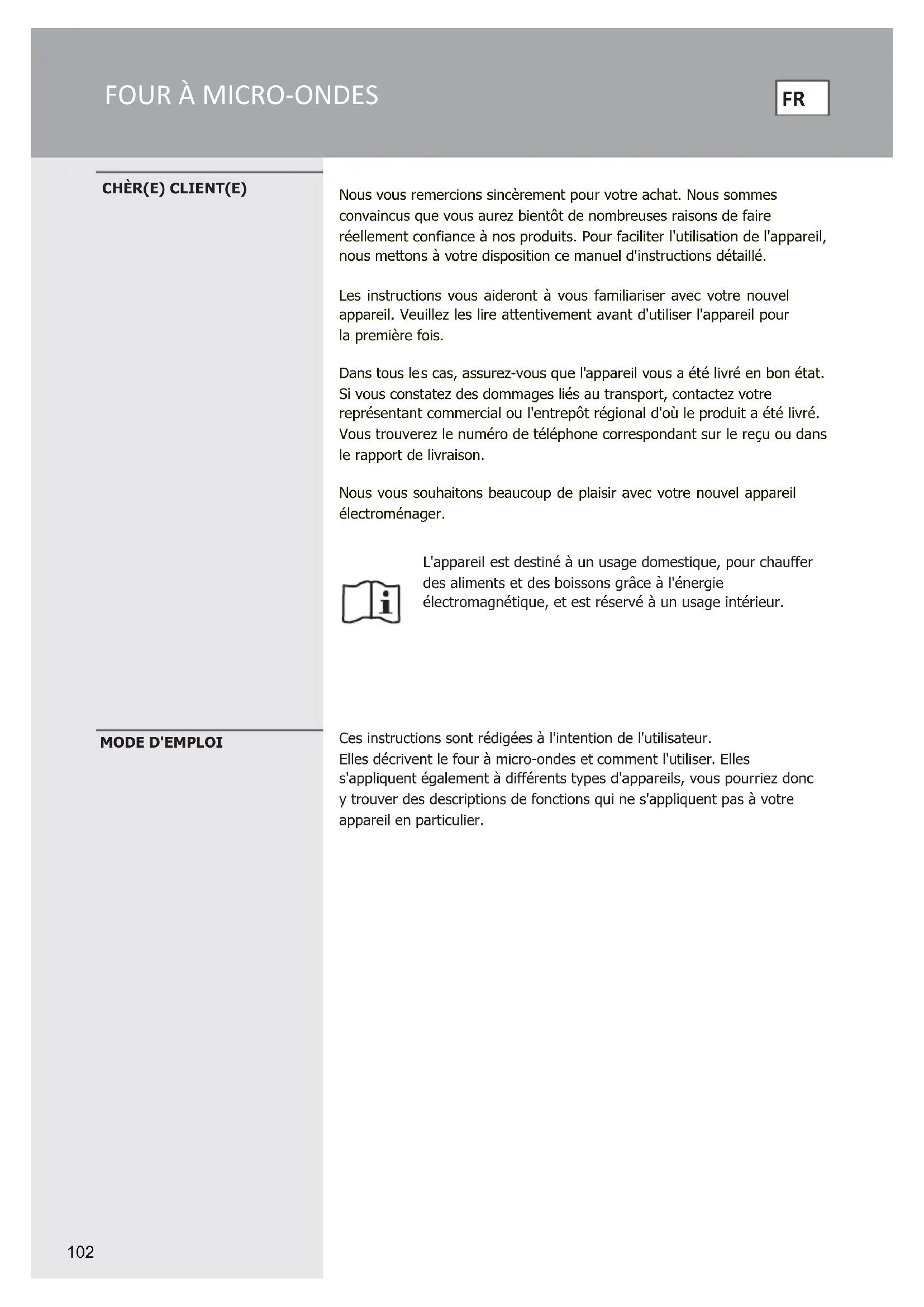 101FOUR À MICRO-ONDES CHÈR(E) CLIENT(E) Nous vous remercions sincèrement pour votre achat. Nous sommes convaincus que vous aurez bientôt de nombreuses raisons de faire réellement confiance à nos produits. Pour faciliter l'utilisation de l'appareil, nous mettons à votre disposition ce manuel d'instructions détaillé. Les instructions vous aideront à vous familiariser avec votre nouvel appareil. Veuillez les lire attentivement avant d'utiliser l'appareil pour la première fois. Dans tous le s cas, assurez-vous que l'appareil vous a été livré en bon état. Si vous constatez des dommages liés au transport, contactez votre représentant commercial ou l'entrepôt régional d'où le produit a été livré. Vous trouverez le numéro de téléphone correspondant sur le reçu ou dans le rapport de livraison. Nous vous souh aitons beaucoup de plaisir avec votre nouvel appareil électroménager. L'appareil est destiné à un usage domestique, pour chauffer des aliments et des boissons grâce à l'énergie électromagnétique, et est réservé à un usage intérieur. MODE D'EMPLOI Ces instructions sont rédigées à l'intention de l'utilisateur. Elles décrivent le four à micro-ondes et comment l'utiliser. Elles s'appliquent également à différents types d'appareils, vous pourriez donc y trouver des descriptions de fonctions qui ne s'appliquent pas à votre appareil en particulier.