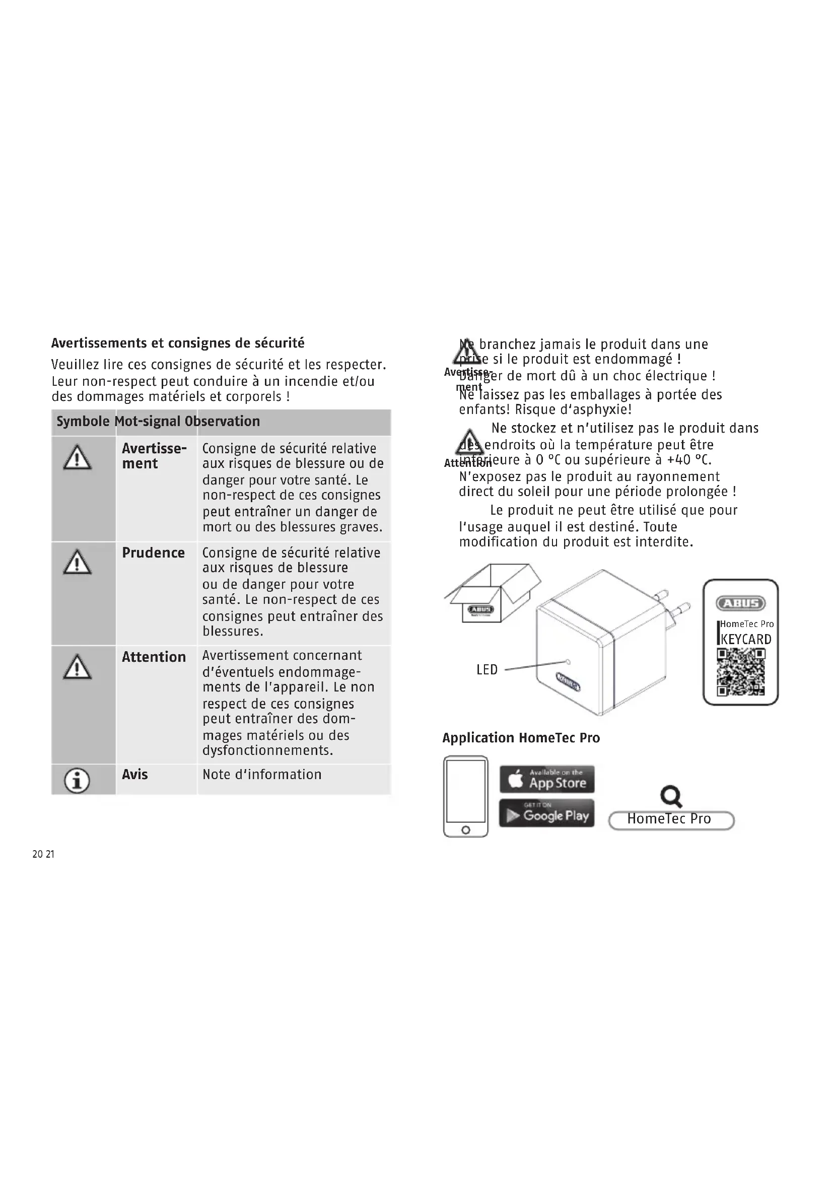 et application ABUS HomeTec Pro) et ce passerelle Wi-Fi, mais aussi avec d’autres composants HomeTec Pro. Le contenu de ce manuel de montage et d’utilisation correspond à l’état actuel du produit au moment de l’impression. En raison des mises à jour et des améliorations, le manuel imprimé peut être obsolète au moment de la mise en service du produit. Nous vous conseillons donc de vous rendre sur notre site Internet et de saisir « CFW3100 » dans le champ de recherche. Sur la page du produit, vous trouverez toujours la version actuelle intégrale du manuel de montage et d’utilisation dans l’onglet « Téléchargements ».20 21 Avertissements et consignes de sécurité Veuillez lire ces consignes de sécurité et les respecter. Leur non-respect peut conduire à un incendie et/ou des dommages matériels et corporels ! Symbole Mot-signal Observation Avertisse- ment Consigne de sécurité relative aux risques de blessure ou de danger pour votre santé. Le non-respect de ces consignes peut entraîner un danger de mort ou des blessures graves. Prudence Consigne de sécurité relative aux risques de blessure ou de danger pour votre santé. Le non-respect de ces consignes peut entraîner des blessures. Attention Avertissement concernant d’éventuels endommage- ments de l’appareil. Le non respect de ces consignes peut entraîner des dom- mages matériels ou des dysfonctionnements. Avis Note d‘information Avertisse- ment Ne branchez jamais le produit dans une prise si le produit est endommagé ! Danger de mort dû à un choc électrique ! Ne laissez pas les emballages à portée des enfants! Risque d‘asphyxie! Ne stockez et n’utilisez pas le produit dans des endroits où la température peut être inférieure à 0 °C ou supérieure à +40 °C. N’exposez pas le produit au rayonnement direct du soleil pour une période prolongée ! Le produit ne peut être utilisé que pour l‘usage auquel il est destiné. Toute modification du produit est interdite. Attention LED HomeTec Pro KEYCARD HomeTec Pro Application HomeTec Pro22 23