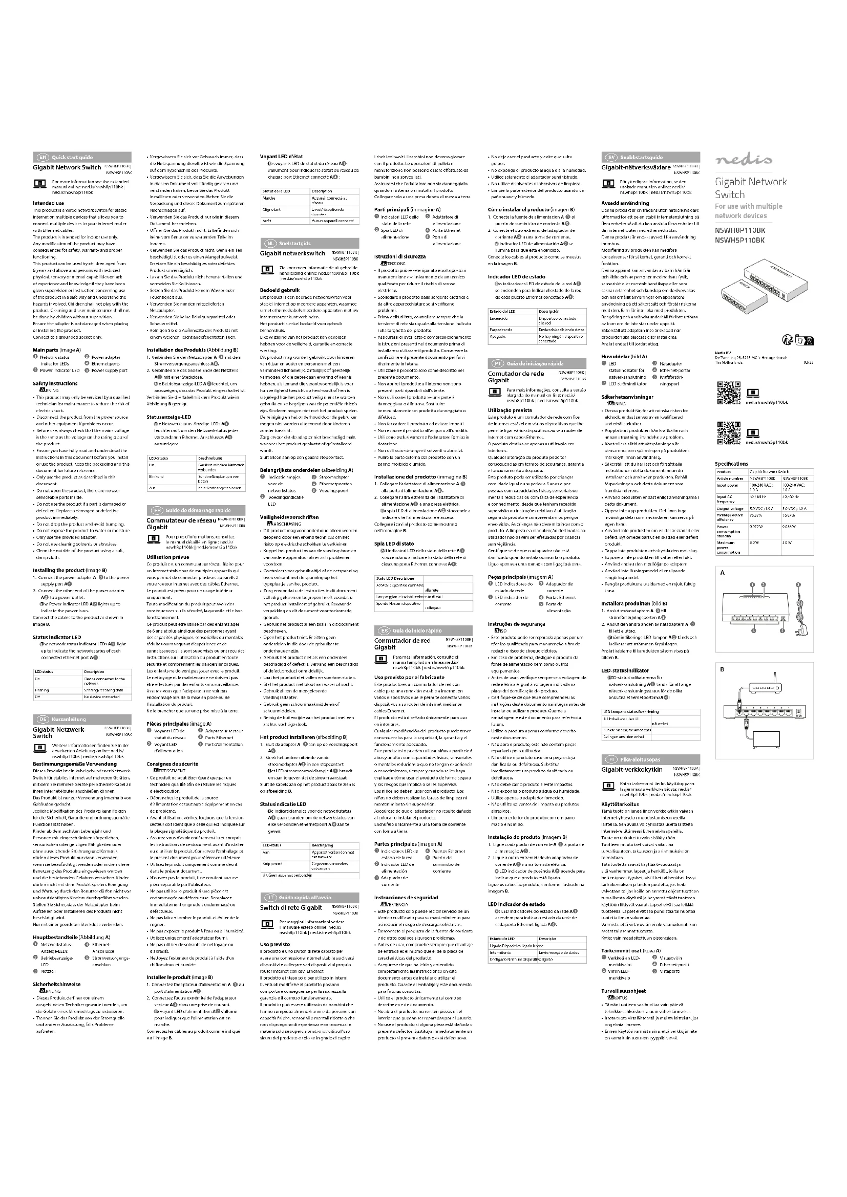 anzuzeigen:LED-Status BeschreibungEin Gerät ist mit dem Netzwerk verbundenBlinkend Senden/Empfangen von DatenAus Kein Gerät angeschlossen Guide de démarrage rapide Commutateur de réseau Gigabit NSWH8P110BK | NSWH5P110BKPour plus d'informations, consultez le manuel détaillé en ligne : ned.is/nswh8p110bk | ned.is/nswh5p110bkUtilisation prévueCe produit est un commutateur réseau laire pour un Internet stable sur de multiples appareils qui vous permet de connecter plusieurs appareils à votre routeur Internet avec des câbles Ethernet.Le produit est prévu pour un usage intérieur uniquement.Toute modication du produit peut avoir des conséquences sur la sécurité, la garantie et le bon fonctionnement.Ce produit peut être utilisé par des enfants âgés de 6 ans et plus ainsi que des personnes ayant des capacités physiques, sensorielles ou mentales réduites ou manquant d’expérience et de connaissances s’ils sont supervisés ou ont reçu des instructions sur l’utilisation du produit en toute sécurité et comprennent les dangers impliqués. Les enfants ne doivent pas jouer avec le produit. Le nettoyage et la maintenance ne doivent pas être eectués par des enfants sans surveillance.Assurez-vous que l’adaptateur ne soit pas endommagé lors de la mise en place ou de l’installation du produit.Ne le brancher que sur une prise mise à la terre.Pièces principales (image A) Voyants LED de statut du réseau Voyant LED d'alimentation Adaptateur secteur Ports Ethernet Port d'alimentationConsignes de sécurité AVERTISSEMENT• Ce produit ne peut être réparé que par un technicien qualié an de réduire les risques d'électrocution.• Débranchez le produit de la source d’alimentation et tout autre équipement en cas de problème.• Avant utilisation, vériez toujours que la tension secteur soit identique à celle qui est indiquée sur la plaque signalétique du produit.• Assurez-vous d'avoir entièrement lu et compris les instructions de ce document avant d'installer ou d'utiliser le produit. Conservez l'emballage et le présent document pour référence ultérieure.• Utilisez le produit uniquement comme décrit dans le présent document.• N’ouvrez pas le produit, il ne contient aucune pièce réparable par l’utilisateur.• Ne pas utiliser le produit si une pièce est endommagée ou défectueuse. Remplacez immédiatement un produit endommagé ou défectueux.• Ne pas laisser tomber le produit et éviter de le cogner.• Ne pas exposer le produit à l'eau ou à l'humidité.• Utilisez uniquement l’adaptateur fourni.• Ne pas utiliser de solvants de nettoyage ou d'abrasifs.• Nettoyez l’extérieur du produit à l’aide d’un chion doux et humide.Installer le produit (image B)1. Connectez l’adaptateur d’alimentation A