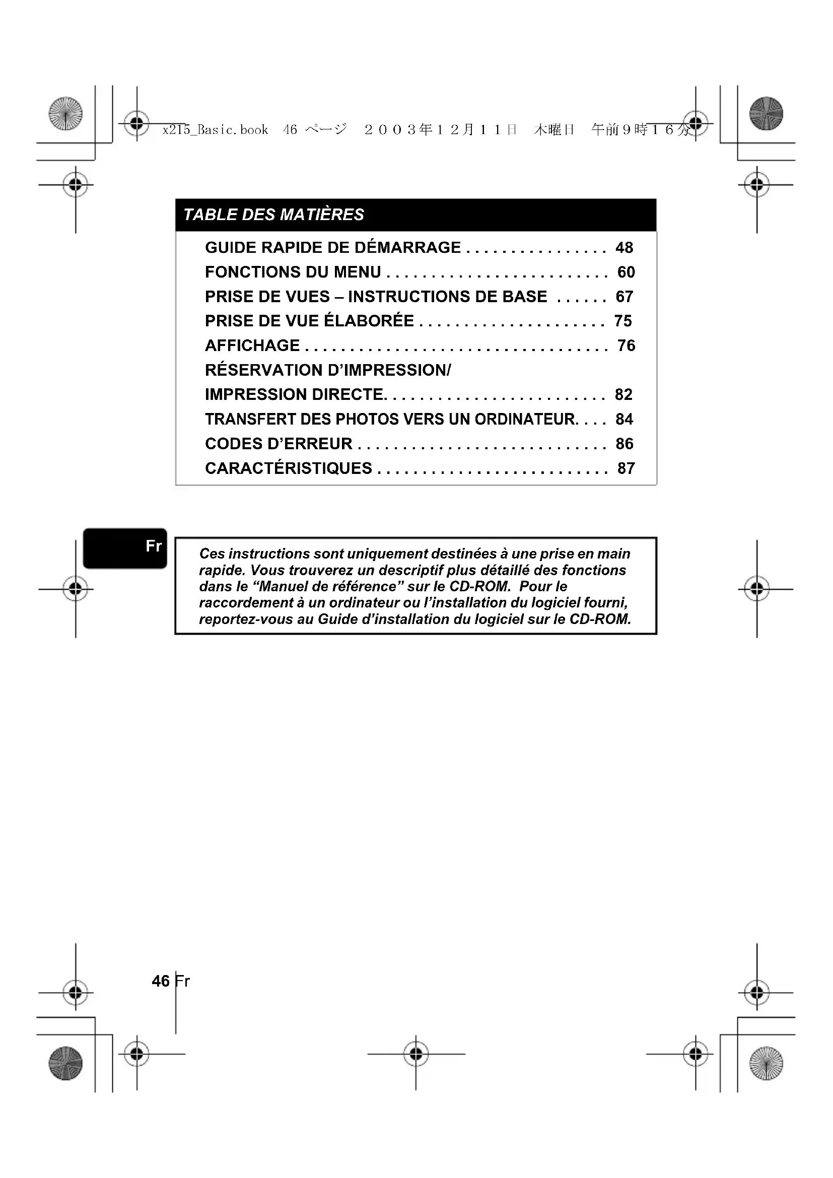 CARACTÉRISTIQUES . . . . . . . . . . . . . . . . . . . . . . . . . . 87 Ces instructions sont uniquement destinées à une prise en main rapide. Vous trouverez un descriptif plus détaillé des fonctions dans le “Manuel de référence” sur le CD-ROM. Pour le raccordement à un ordinateur ou l’installation du logiciel fourni, reportez-vous au Guide d’installation du logiciel sur le CD-ROM. x215_Basic.book 46 ページ 2003年12月11日 木曜日 午前9時16分Fr 47