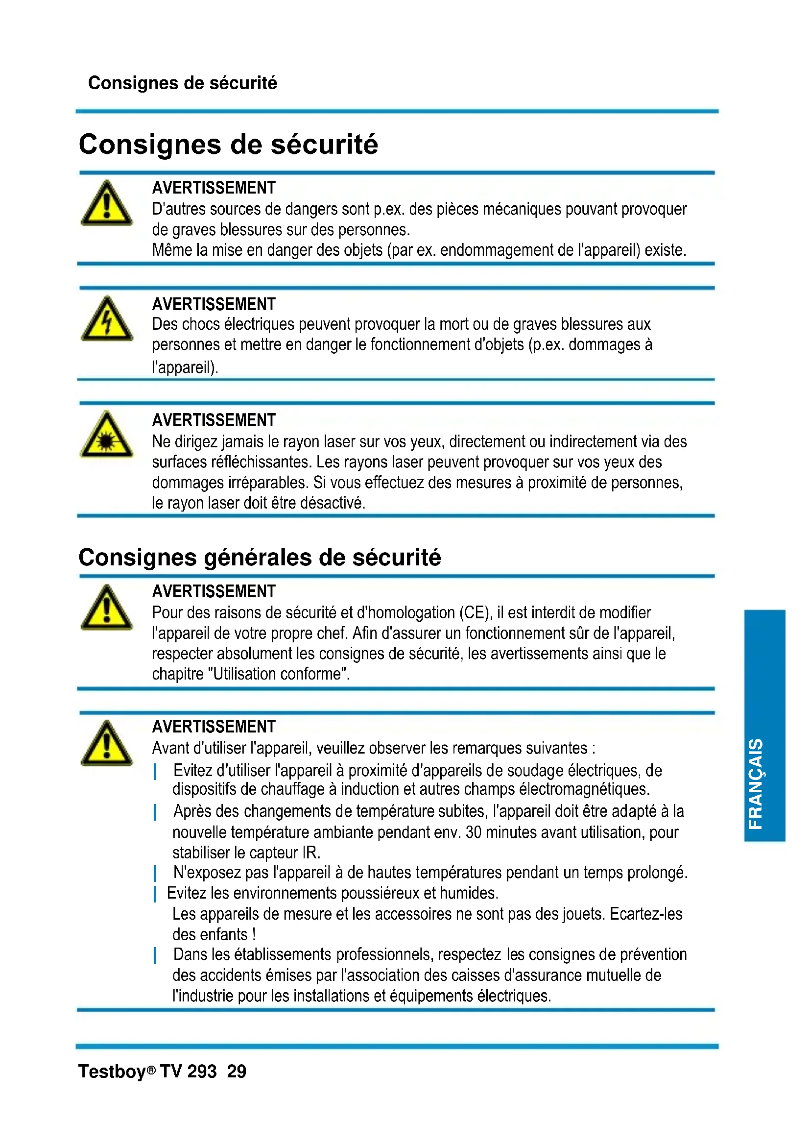 AVERTISSEMENT Avant d'utiliser l'appareil, veuillez observer les remarques suivantes : | Evitez d'utiliser l'appareil à proximité d'appareils de soudage électriques, de dispositifs de chauffage à induction et autres champs électromagnétiques. | Après des changements de température subites, l'appareil doit être adapté à la nouvelle température ambiante pendant env. 30 minutes avant utilisation, pour stabiliser le capteur IR. | N'exposez pas l'appareil à de hautes températures pendant un temps prolongé. | Evitez les environnements poussiéreux et humides. Les appareils de mesure et les accessoires ne sont pas des jouets. Ecartez-les des enfants ! | Dans les établissements professionnels, respectez les consignes de prévention des accidents émises par l'association des caisses d'assurance mutuelle de l'industrie pour les installations et équipements électriques.Consignes de sécurité 30 Testboy