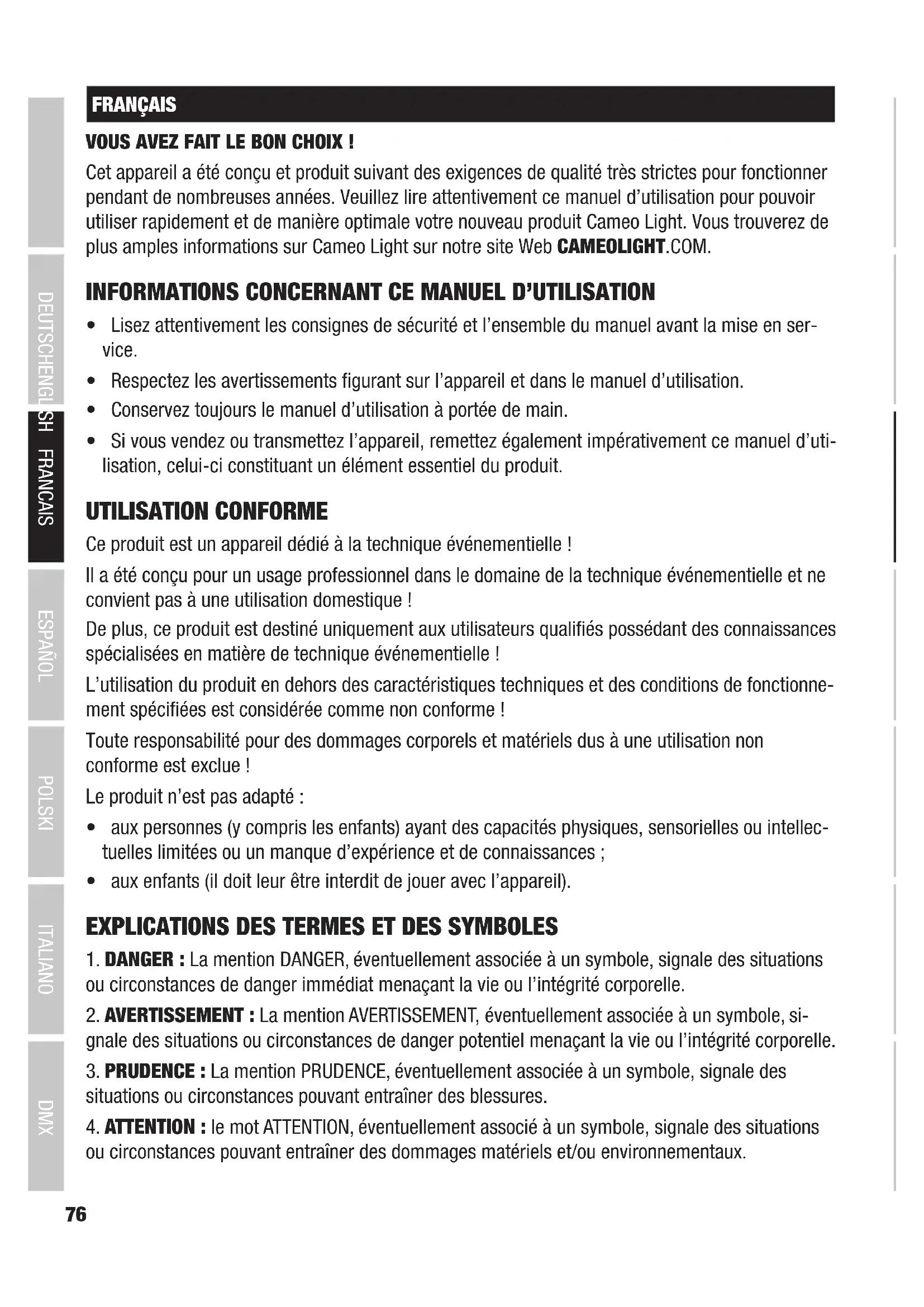 ou circonstances pouvant entraîner des dommages matériels et/ou environnementaux.77 DMX DEUTSCHFRANCAIS ESPAÑOL ENGLISH ITALIANO POLSKI Ce symbole indique un danger susceptible de provoquer une décharge électrique. Ce symbole indique une zone ou une situation dangereuse. Ce symbole indique des dangers liés à des surfaces chaudes. Ce symbole signale des dangers liés à des sources lumineuses intenses. Ce symbole indique que l’appareil ne contient aucune pièce remplaçable par l’utilisateur. Ce symbole indique des informations complémentaires sur l’utilisation du produit.