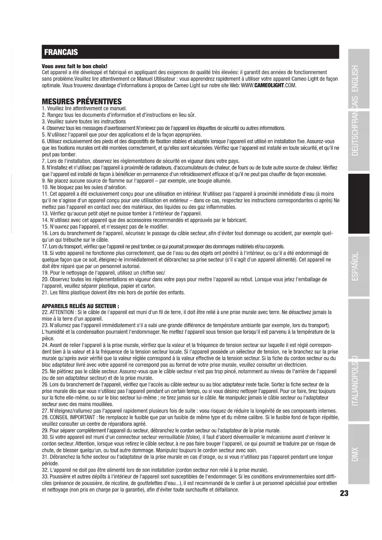 Nos conditions actuelles de garantie et de limitation de responsabilité sont disponibles à l‘adresse suivante : https://cdn-shop.adamhall.com/ media/pdf/Manufacturers-Declarations-CAMEO_DE_EN_ES_FR.pdf. Pour les réparations, veuillez contacter Adam Hall GmbH, Adam-Hall-Str. 1, 61267 Neu Anspach / E-Mail Info@adamhall.com / +49 (0)6081 / 9419-0. TRI ET MISE AUX DÉCHETS CORRECTE DE CE PRODUIT (Valid in the European Union and other European countries with waste separation) (Applicable dans l‘Union Européenne et les autres pays européens pratiquant le tri des déchets) La présence de ce symbole sur le produit ou sur la documentation correspondante indique qu‘en fin de vie, le produit ne doit pas être jeté avec les déchets normaux, afin d‘éviter tout dommage à l‘environnement ou aux personnes consécutive à une élimination non contrôlée des déchets. Séparez-le des aut- res types de déchets et recyclez-le, afin de promouvoir la réutilisation durable des ressources naturelles. Nous conseillons aux utilisateurs non professionnels de contacter le revendeur chez qui ils ont acheté le produit, ou un représentant gouvernemental local, pour plus de détails sur le lieu de collecte et la façon de recycler cet appareil dans le meilleur respect de l‘environnement possible.. Nous invitons les utilisateurs professionnels à contacter leur fournisseur et à vérifier les termes et conditions de leur contrat d‘achat. Ce produit ne doit pas être mélangé à d‘autres déchets commerciaux lors de la collecte. Conformité CE La société Adam Hall GmbH déclare par la présente que ce produit est compatible avec les régulations suivantes (le cas échéant) : R&TTE (1999/5/EG) et RED (2014/53/EU) à partir de juin 2017 Directive basse tension (2014/35/EU) Directive CEM (2014/30/EU) RoHS (2011/65/EU) La Déclaration de Conformité complète est disponible sur le site Web www.adamhall.com. Pour toute information complémentaire, contactez-nous : info@adamhall.com.33 DMX DEUTSCHFRANCAIS ESPAÑOL ENGLISH ITALIANO POLSKI ESPAÑOL ¡GRACIAS POR ELEGIR CAMEO LIGHT! Este equipo está diseñado y fabricado con los estándares de calidad más exigentes, para garantizar un correcto funcionamiento durante muchos años.Lea atentamente este manual de usuario para poder aprovechar rápidamente toda la funcionalidad de su nuevo producto de Cameo Light. Más información sobre Cameo Light en la web WWW.CAMEOLIGHT.COM.