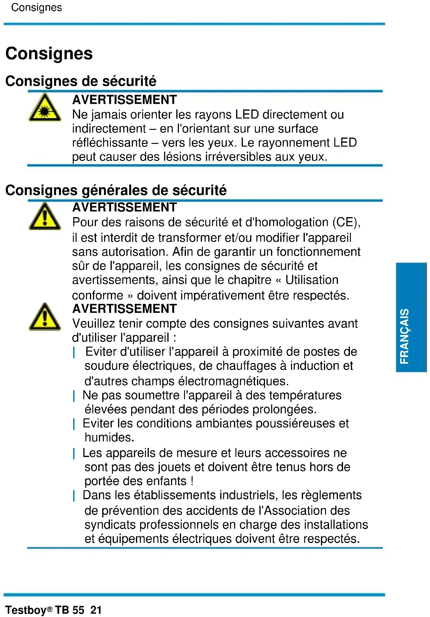 AVERTISSEMENT Veuillez tenir compte des consignes suivantes avant d'utiliser l'appareil : | Eviter d'utiliser l'appareil à proximité de postes de soudure électriques, de chauffages à induction et d'autres champs électromagnétiques. | Ne pas soumettre l'appareil à des températures élevées pendant des périodes prolongées. | Eviter les conditions ambiantes poussiéreuses et humides. | Les appareils de mesure et leurs accessoires ne sont pas des jouets et doivent être tenus hors de portée des enfants ! | Dans les établissements industriels, les règlements de prévention des accidents de l'Association des syndicats professionnels en charge des installations et équipements électriques doivent être respectés.Consignes 22 Testboy