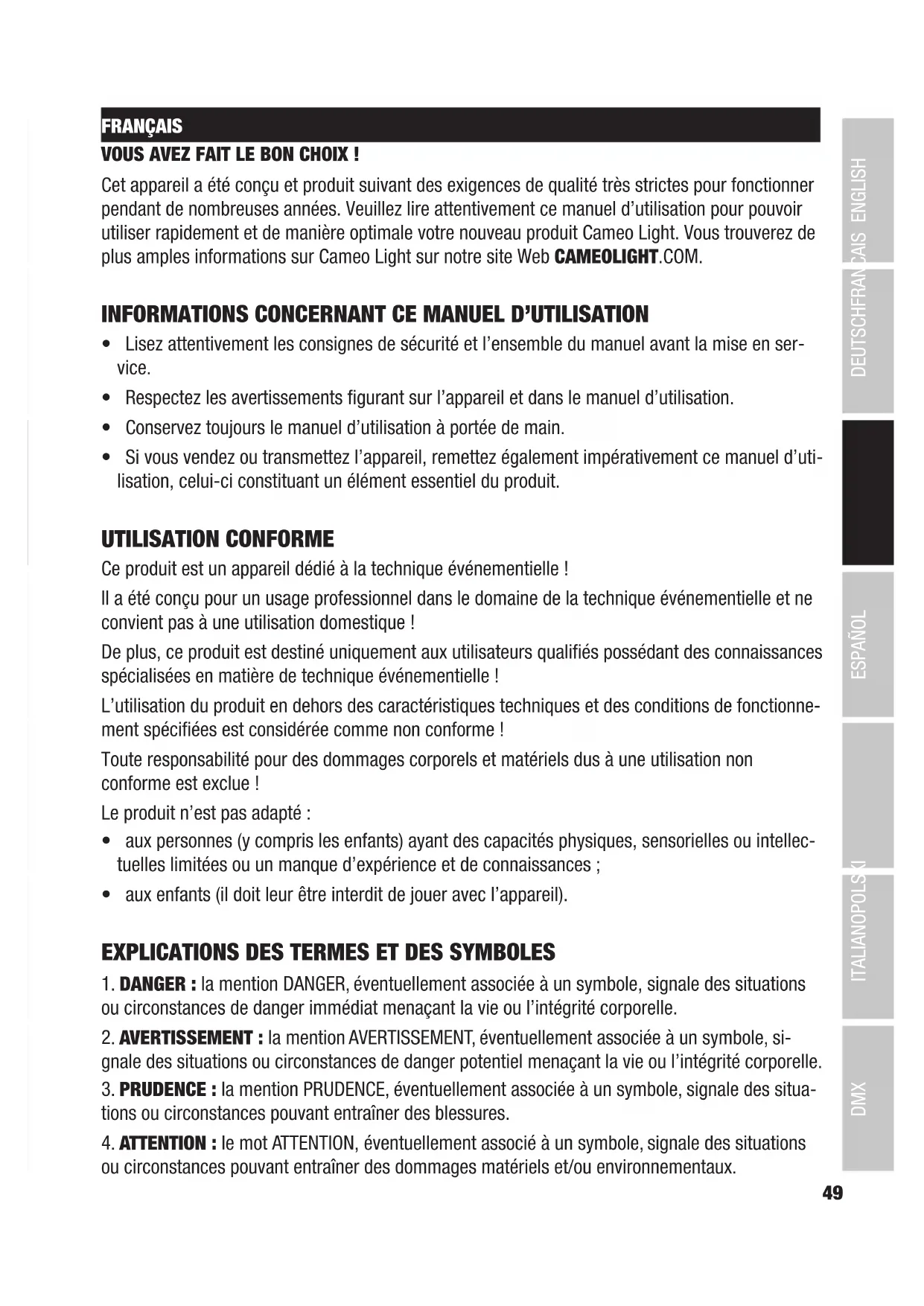 ou circonstances pouvant entraîner des dommages matériels et/ou environnementaux.50 DMX ITALIANO POLSKI ESPAÑOL FRANCAIS DEUTSCHENGLISH Ce symbole indique un danger susceptible de provoquer une décharge électrique. Ce symbole indique une zone ou une situation dangereuse. Ce symbole indique des dangers liés à des surfaces chaudes. Ce symbole signale des dangers liés à des sources lumineuses intenses. Ce symbole indique que l’appareil ne contient aucune pièce remplaçable par l’utilisa- teur. Ce symbole indique des informations complémentaires sur l’utilisation du produit.