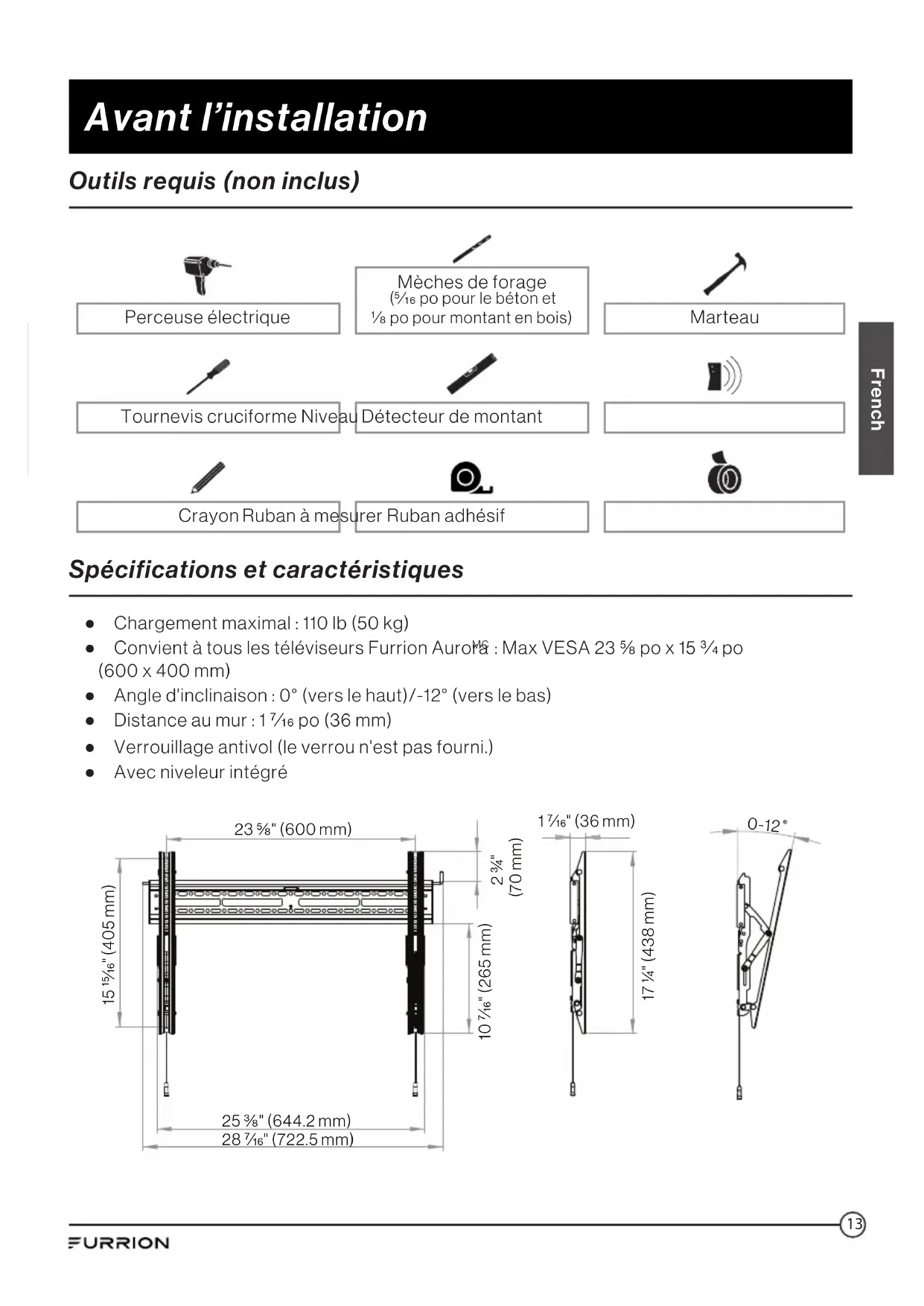 d'étouffement en cas d’ingestion. (A) vis de calage ST8*63(x4) et attachemétallique (x1) (B) rondelle Φ9,5*Φ21*2,0(x4) (C) ancrage Φ10*50/PA6(x6) (D) vis cruciforme M6*16(x4) (E) vis cruciforme M6*18(x4) (F) vis cruciforme M6*25(x4) (G) rondelle Φ6,4*Φ18*1,5(x4) (H) vis cruciforme M8*18(x4) (I) vis cruciforme M8*25(x4) (J) rondelle Φ8,4*Φ19*2.0(x4) (K) entretoise Φ8*Φ18*10(x8) French13 Avant l’installation French Outils requis (non inclus) Perceuse électrique Mèches de forage (po pour le béton et po pour montant en bois) Marteau Tournevis cruciforme Niveau Détecteur de montant Crayon Ruban à mesurer Ruban adhésif Spécifications et caractéristiques ● Chargement maximal: 110lb (50kg) ● Convient à tous les téléviseurs Furrion Aurora