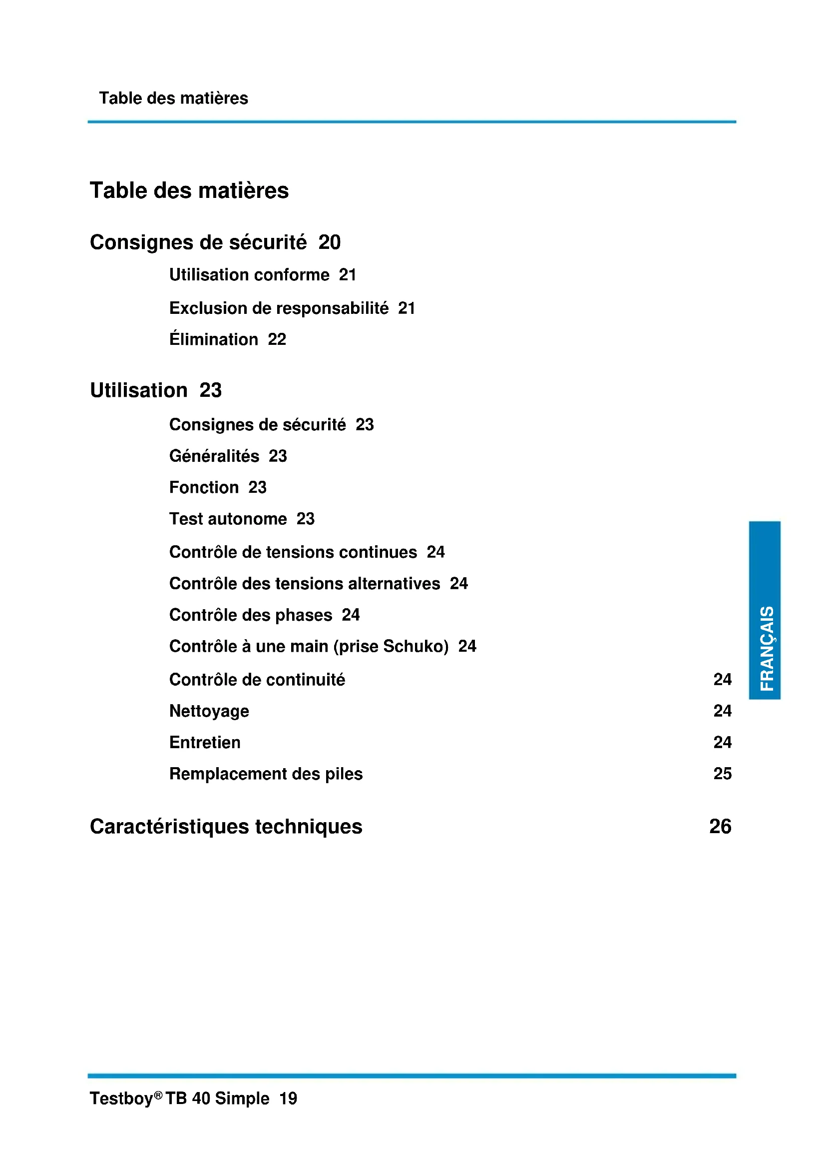 TB 40 Simple 19 ENGLISH FRANÇAIS Table des matières Consignes de sécurité 20 Utilisation conforme 21 Exclusion de responsabilité 21 Élimination 22 Utilisation 23 Consignes de sécurité 23 Généralités 23 Fonction 23 Test autonome 23 Contrôle de tensions continues 24 Contrôle des tensions alternatives 24 Contrôle des phases 24 Contrôle à une main (prise Schuko) 24 Contrôle de continuité 24 Nettoyage 24 Entretien 24 Remplacement des piles 25 Caractéristiques techniques 26Consignes de sécurité 20 Testboy