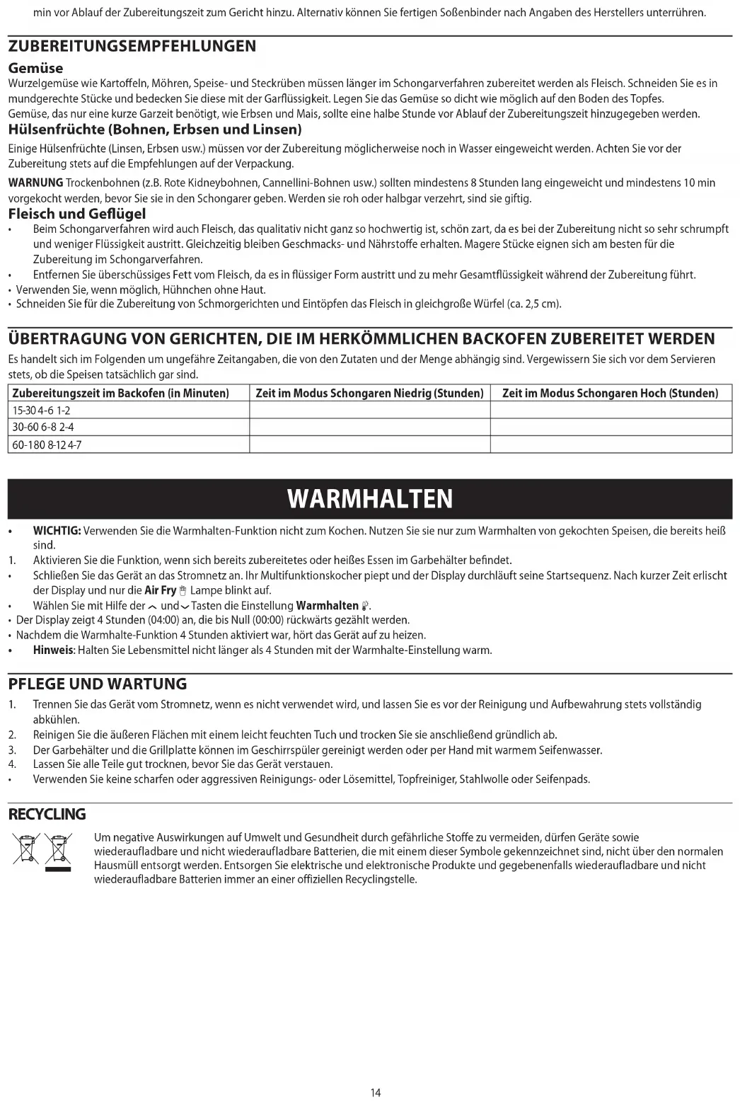 - Coupez la viande en cubes de taille régulière (environ 2,5 cm) pour les pot-au-feu et les ragoûts. CONVERSION DES RECETTES AVEC UN FOUR TRADITIONNEL Ces temps sont approximatifs et peuvent varier en fonction des ingrédients et des quantités. Vérifiez toujours que l’aliment est intégralement cuit avant de le servir. Temps de cuisson au four (minutes) Temps de cuisson en Cuisson lente basse puissance (heures) Temps de cuisson en Cuisson lente haute puissance (heures) 15-30 4-6 1-2 30-60 6-8 2-4 60-180 8-12 4-7 MAINTENIR CHAUD