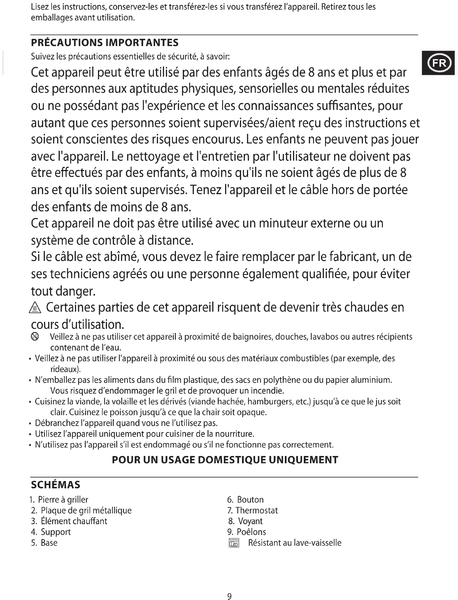 Suivez les précautions essentielles de sécurité, à savoir: Cet appareil peut être utilisé par des enfants âgés de 8 ans et plus et par des personnes aux aptitudes physiques, sensorielles ou mentales réduites ou ne possédant pas l'expérience et les connaissances suffisantes, pour autant que ces personnes soient supervisées/aient reçu des instructions et soient conscientes des risques encourus. Les enfants ne peuvent pas jouer avec l'appareil. Le nettoyage et l'entretien par l'utilisateur ne doivent pas être effectués par des enfants, à moins qu'ils ne soient âgés de plus de 8 ans et qu'ils soient supervisés. Tenez l'appareil et le câble hors de portée des enfants de moins de 8 ans. Cet appareil ne doit pas être utilisé avec un minuteur externe ou un système de contrôle à distance. Si le câble est abîmé, vous devez le faire remplacer par le fabricant, un de ses techniciens agréés ou une personne également qualifiée, pour éviter tout danger.