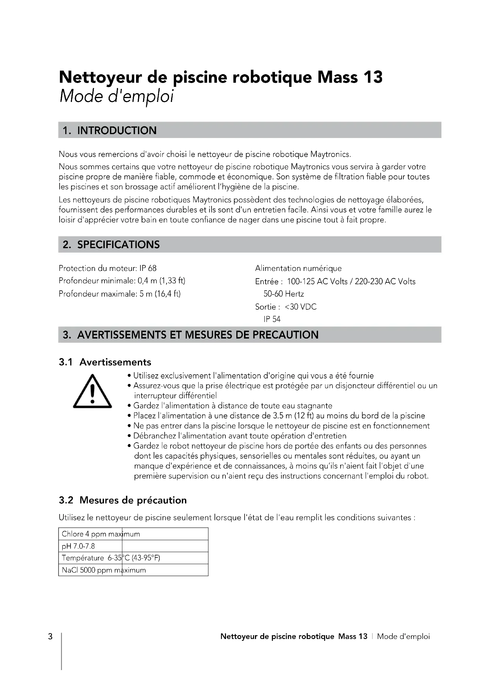 Nettoyeur de piscine robotique Mass 13 | Mode d'emploi Nettoyeur de piscine robotique Mass 13 Mode d'emploi