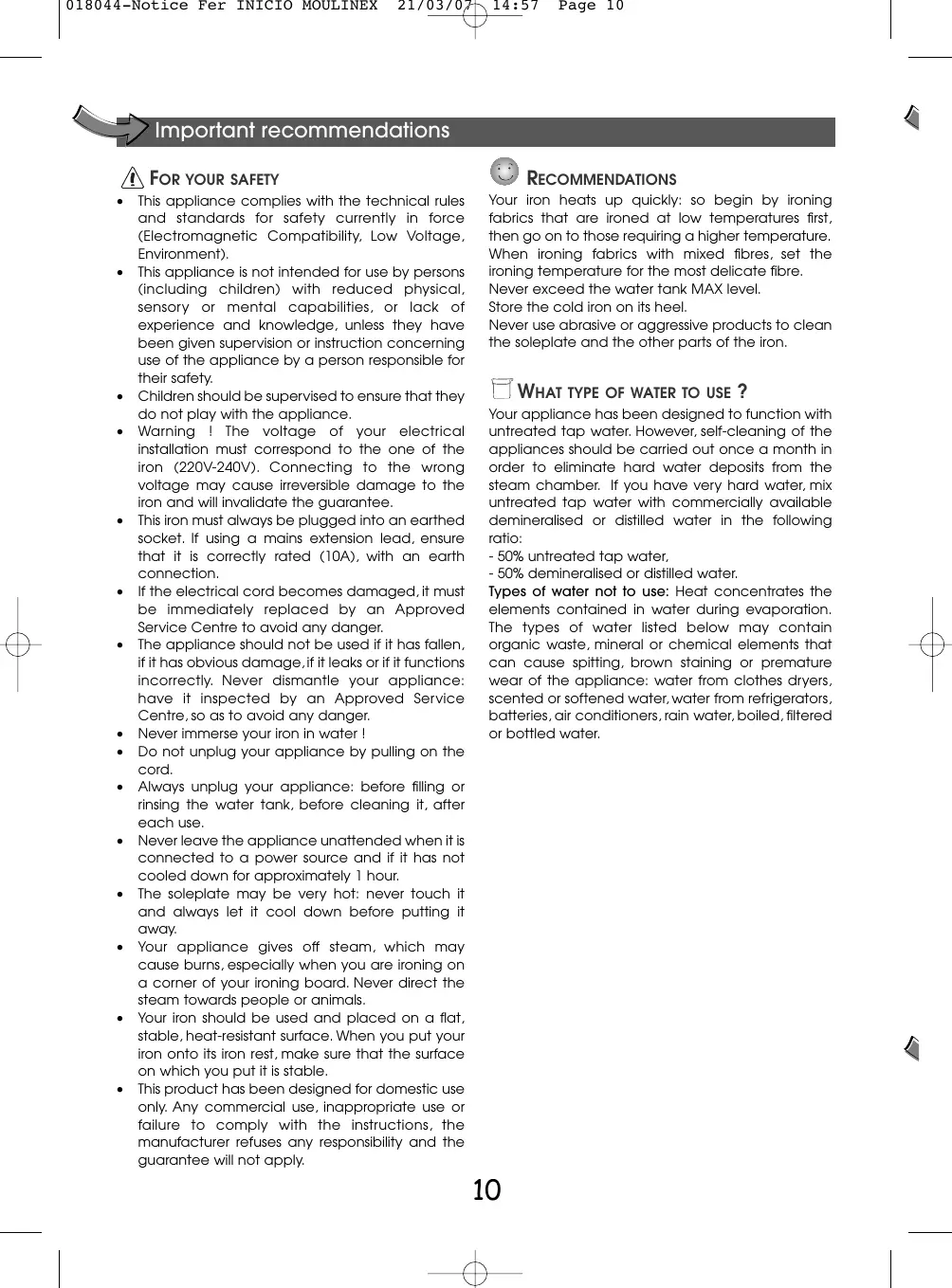 Pour votre sécurité, cet appareil est conforme aux normes et réglementations applicables (Directives Basse Tension, Compatibilité Electromagnétique, Environnement …). Cet appareil n’est pas prévu pour être utilisé par des personnes (y compris les enfants) dont les capacités physiques, sensorielles ou mentales sont réduites, ou des personnes dénuées d’expérience ou de connaissance, sauf si elles ont pu bénéficier, par l’intermédiaire d’une personne responsable de leur sécurité, d’une surveillance ou d’instructions préalables concernant l’utilisation de l’appareil. Il convient de surveiller les enfants pour s’assurer qu’ils ne jouent pas avec l’appareil. Attention! la tension de votre installation électrique doit correspondre à celle du fer (220-240V). Toute erreur de branchement peut causer un dommage irréversible au fer et annule la garantie. Ce fer doit être obligatoirement branché sur une prise de courant avec terre. Si vous utilisez une rallonge, vérifiez qu’elle est de type bipolaire (10A) avec conducteur de terre. Si le câble d’alimentation est endommagé, il doit être immédiatement remplacé par un Centre Service Agréé, afin d’éviter un danger. L’appareil ne doit pas être utilisé s’il a chuté, s’il présente des dommages apparents, s’il fuit ou présente des anomalies de fonctionnement. Ne démontez jamais votre appareil : faites-le examiner dans un Centre Service Agréé, afin d’éviter un danger. Ne plongez jamais le fer dans l’eau! Ne débranchez pas l’appareil en tirant sur le cordon. Débranchez toujours votre appareil : avant de le remplir ou de rincer le réservoir, avant de le nettoyer, après chaque utilisation. Ne laissez jamais l’appareil sans surveillance lorsqu’il est raccordé à l’alimentation électrique et tant qu’il n’a pas refroidi environ 1 heure. La semelle du fer peut être très chaude : ne la touchez jamais et laissez toujours refroidir votre fer avant de le ranger. Votre appareil émet de la vapeur qui peut occasionner des brûlures, spécialement lorsque vous repassez sur un angle de votre table à repasser. Ne dirigez jamais la vapeur sur des personnes ou des animaux. Votre fer doit être utilisé et posé sur une surface stable. Lorsque vous posez votre fer sur son reposefer, assurez-vous que la surface sur laquelle vous le posez est stable. Ce produit a été conçu pour un usage domestique uniquement. Pour tout usage inapproprié ou contraire aux instructions, la marque décline toute responsabilité et la garantie n’est plus valable.