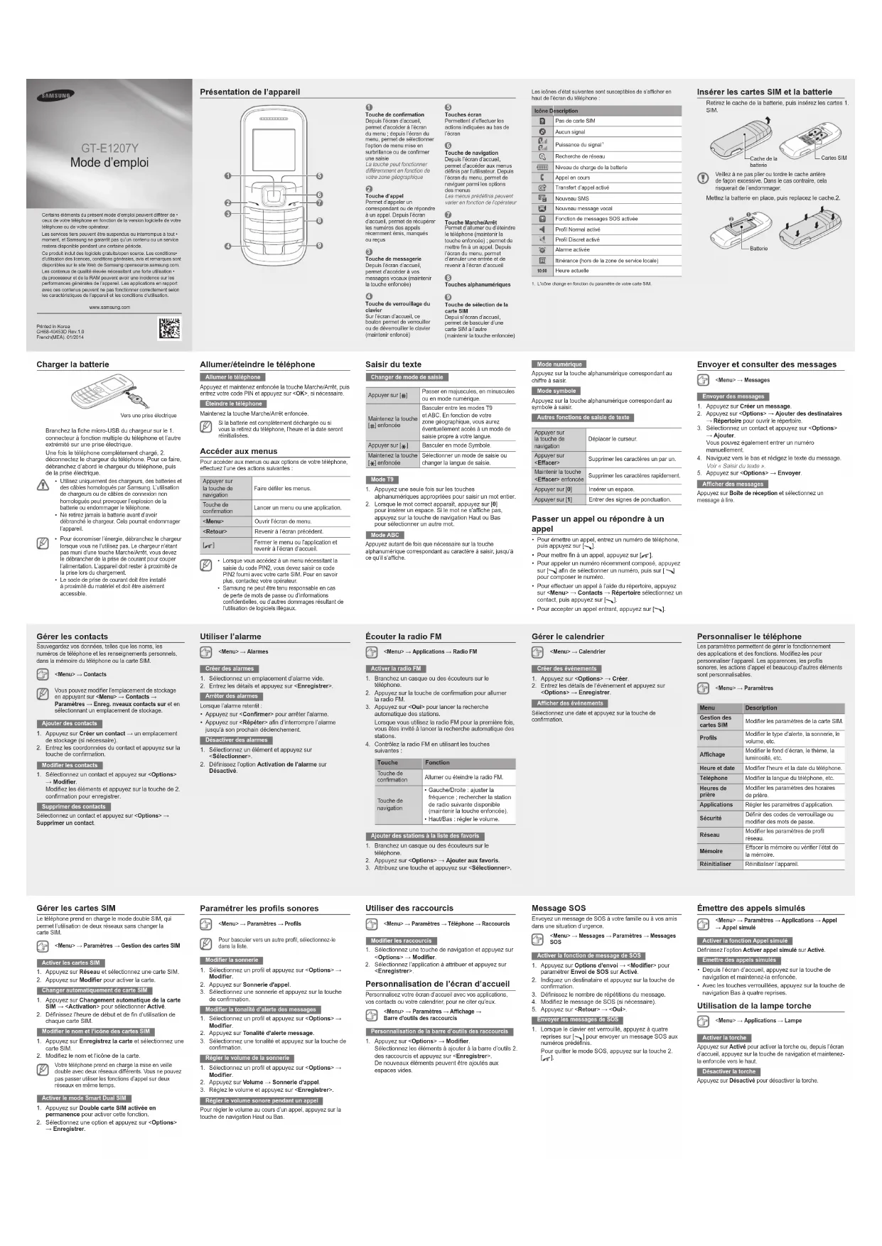 Présentation de l’appareil GT-E1207Y Mode d’emploi www.samsung.comPrinted in KoreaGH68-40453D Rev.1.0French(MEA). 01/2014Certains éléments du présent mode d’emploi peuvent différer de •ceux de votre téléphone en fonction de la version logicielle de votre téléphone ou de votre opérateur.Les services tiers peuvent être suspendus ou interrompus à tout •moment, et Samsung ne garantit pas qu’un contenu ou un service restera disponible pendant une certaine période.Ce produit inclut des logiciels gratuits/open source. Les conditions• d’utilisation des licences, conditions générales, avis et remarques sont disponibles sur le site Web de Samsung opensource.samsung.com.Les contenus de qualité élevée nécessitant une forte utilisation •du processeur et de la RAM peuvent avoir une incidence sur les performances générales de l’appareil. Les applications en rapport avec ces contenus peuvent ne pas fonctionner correctement selon les caractéristiques de l’appareil et les conditions d’utilisation.