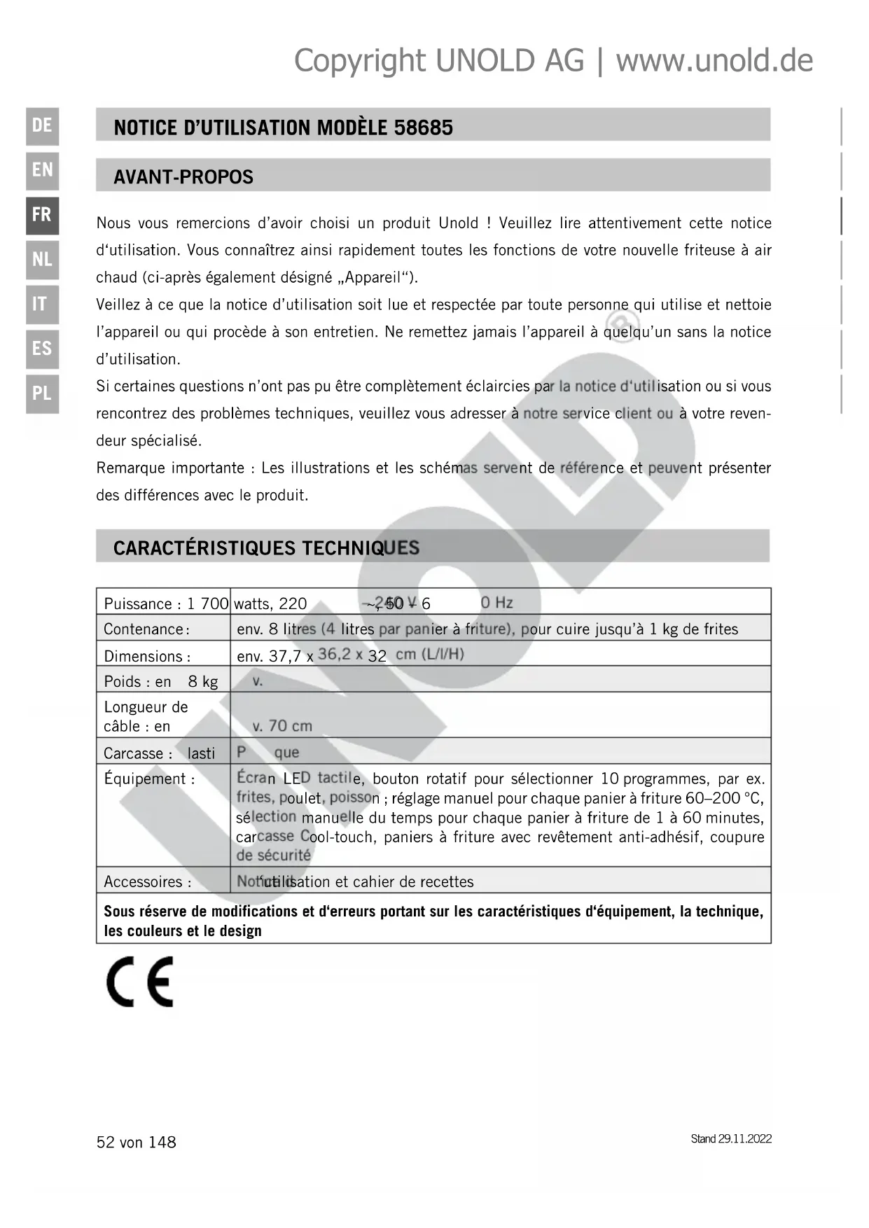 Puissance : 1 700 watts, 220 – 240 V~, 50 – 60 Hz Contenance : env. 8 litres (4 litres par panier à friture), pour cuire jusqu’à 1 kg de frites Dimensions : env. 37,7 x 36,2 x 32 cm (L/l/H) Poids : env. 8 kg Longueur de câble : env. 70 cm Carcasse : Plastique Équipement : Écran LED tactile, bouton rotatif pour sélectionner 10 programmes, par ex. frites, poulet, poisson ; réglage manuel pour chaque panier à friture 60–200 °C, sélection manuelle du temps pour chaque panier à friture de 1 à 60 minutes, carcasse Cool-touch, paniers à friture avec revêtement anti-adhésif, coupure de sécurité Accessoires : Notice d‘utilisation et cahier de recettes Sous réserve de modifications et d‘erreurs portant sur les caractéristiques d‘équipement, la technique, les couleurs et le design Copyright UNOLD AG | www.unold.deStand 29.11.2022 53 von 148