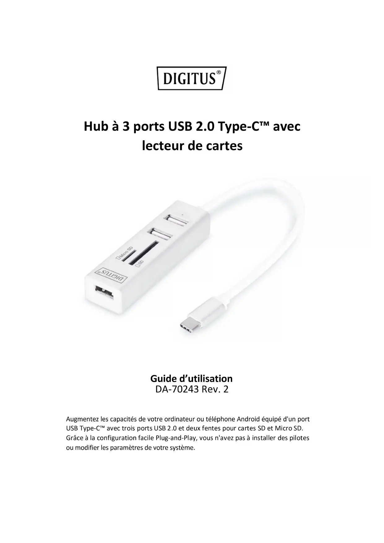 Augmentez les capacités de votre ordinateur ou téléphone Android équipé d'un port USB Type-C™ avec trois ports USB 2.0 et deux fentes pour cartes SD et Micro SD. Grâce à la configuration facile Plug-and-Play, vous n'avez pas à installer des pilotes ou modifier les paramètres de votre système.Description Ce hub est destiné aux ordinateurs et appareils intelligents de dernière génération dotés de ports USB-C. Ce hub à câble USB est un adaptateur 2 en 1 pour PC, ordinateurs et appareils portables.