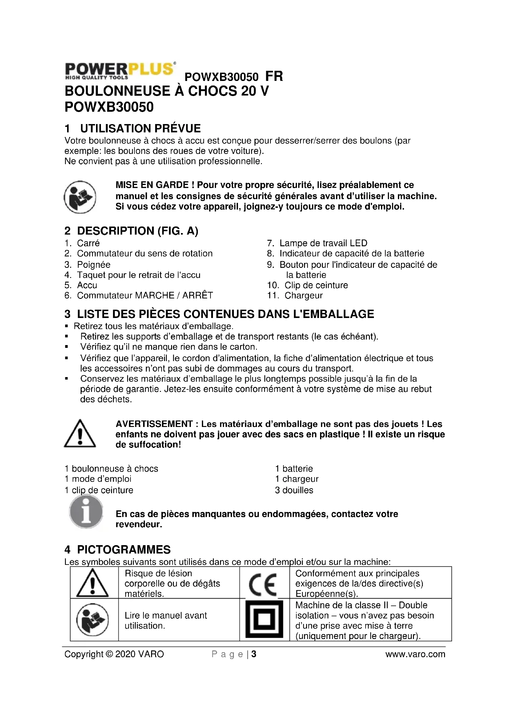 Machine de la classe II – Double isolation – vous n’avez pas besoin d’une prise avec mise à terre (uniquement pour le chargeur).POWXB30050 FR Copyright © 2020 VARO P a g e | 4 www.varo.com