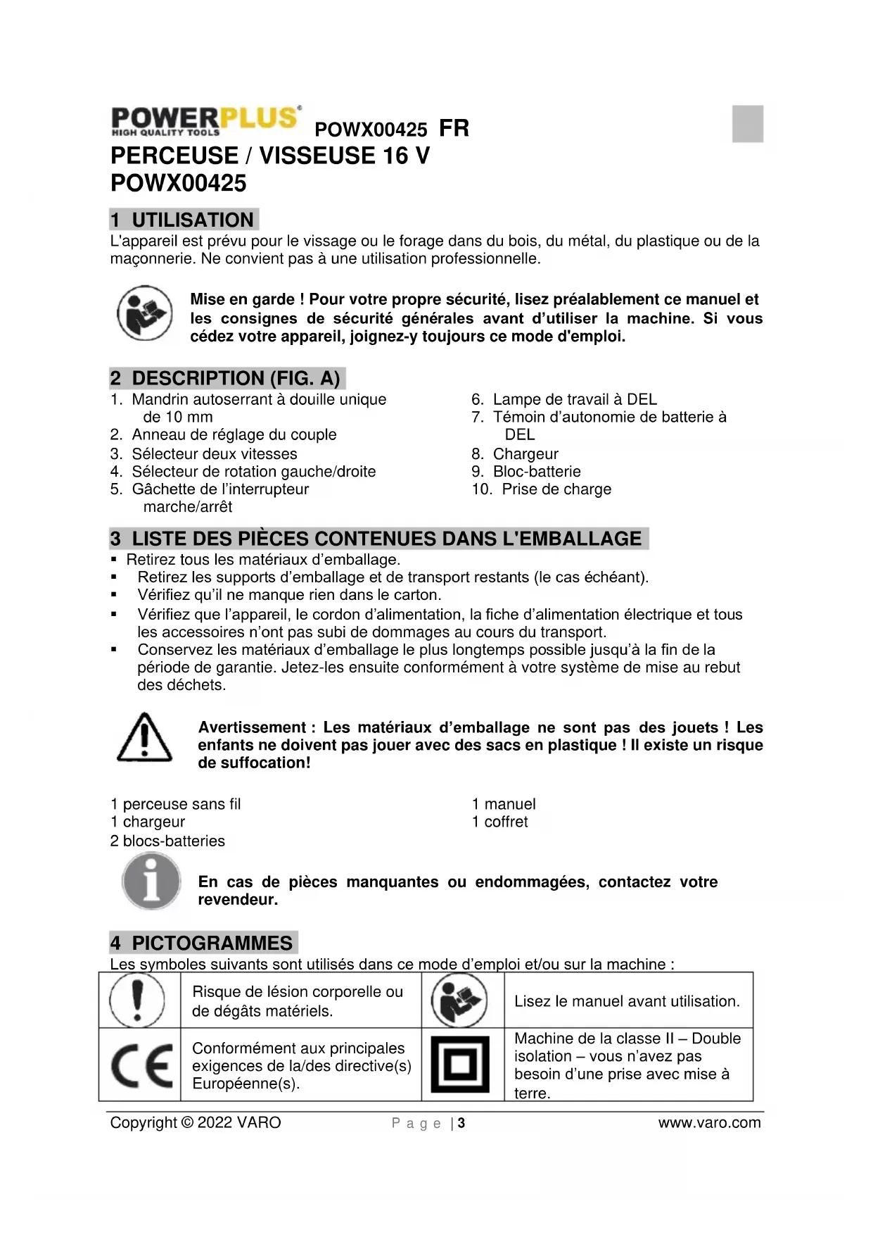 VARO N.V. - Vic. Van Rompuy N.V.- Joseph Van Instraat 9 - BE2500 Lier - BELGIQUE, déclare que : Appareil : Perceuse / Visseus Marque : POWERplus Modèles : POWX00425 est en conformité avec les exigences essentielles et les autres dispositions pertinentes des Directives européennes applicables, basées sur l'application des normes européennes harmonisées. Toute modification non autorisée de l'appareil annule cette déclaration. Directives européennes (y compris, le cas échéant, leurs amendements à la date de la signature) : 2014/30/EU 2006/42/CE 2011/65/EU Normes européennes harmonisées (y compris, le cas échéant, leurs amendements à la date de la signature) : EN62841-1 : 2015 EN62841-2-1 : 2018 EN55014-1 : 2017 EN55014-2 : 2015 Détenteur de la Documentation technique : Philippe Vankerkhove, VARO – Vic. Van Rompuy N.V. Le soussigné agit au nom du PDG de l'entreprise, Ludo Mertens Réglementation – Directeur de la conformité 22/12/2021, Lier - BelgiumPOWX00425 EN Copyright © 2022 VARO P a g e | 1 www.varo.com 1 APPLICATION ................................................................................ 3