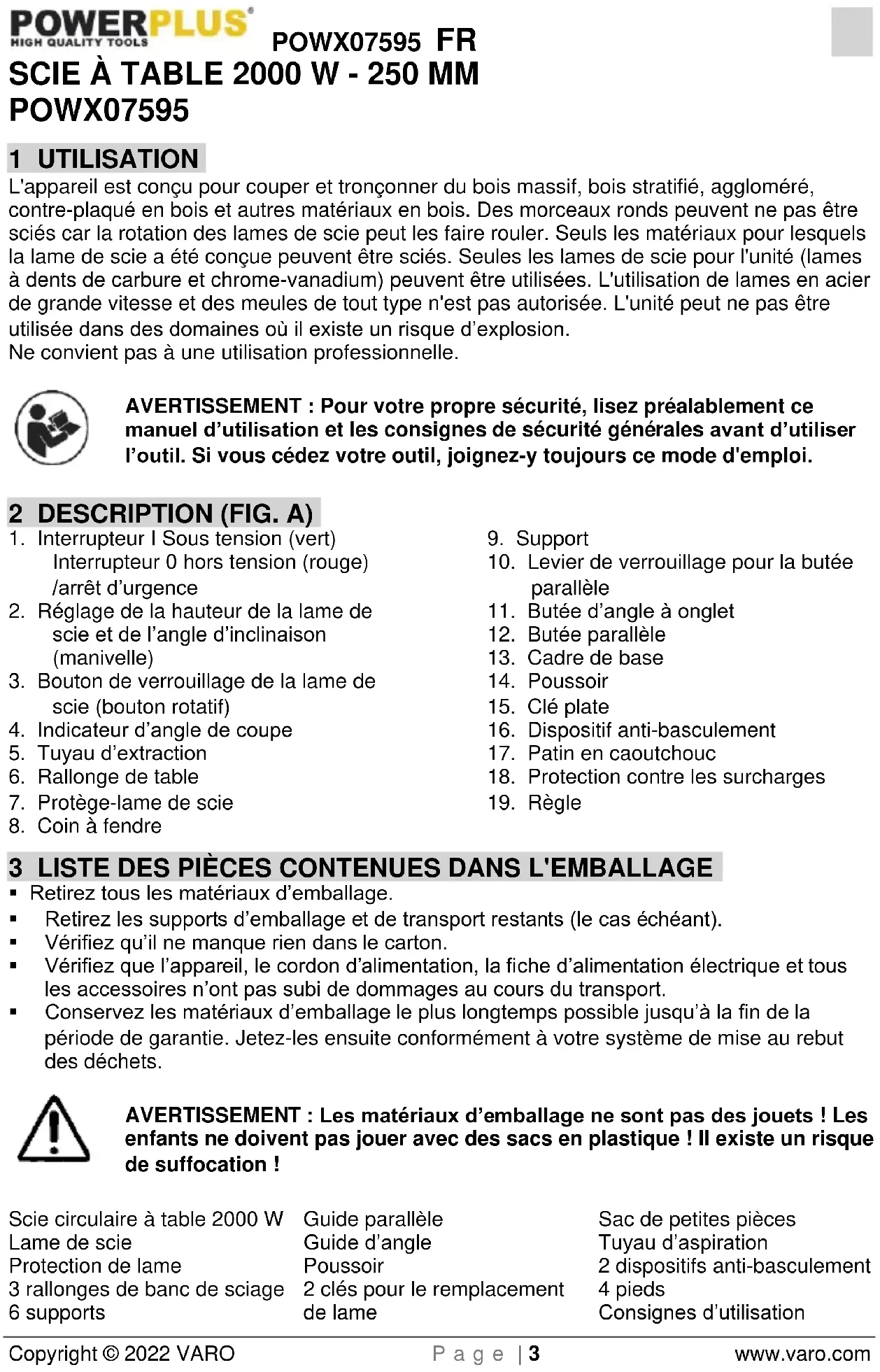 enfants ne doivent pas jouer avec des sacs en plastique ! Il existe un risque de suffocation ! Scie circulaire à table 2000 W Lame de scie Protection de lame 3 rallonges de banc de sciage 6 supports Guide parallèle Guide d’angle Poussoir 2 clés pour le remplacement de lame Sac de petites pièces Tuyau d’aspiration 2 dispositifs anti-basculement 4 pieds Consignes d’utilisationPOWX07595 FR Copyright © 2022 VARO P a g e | 4 www.varo.com En cas de pièces manquantes ou endommagées, contactez votre revendeur.