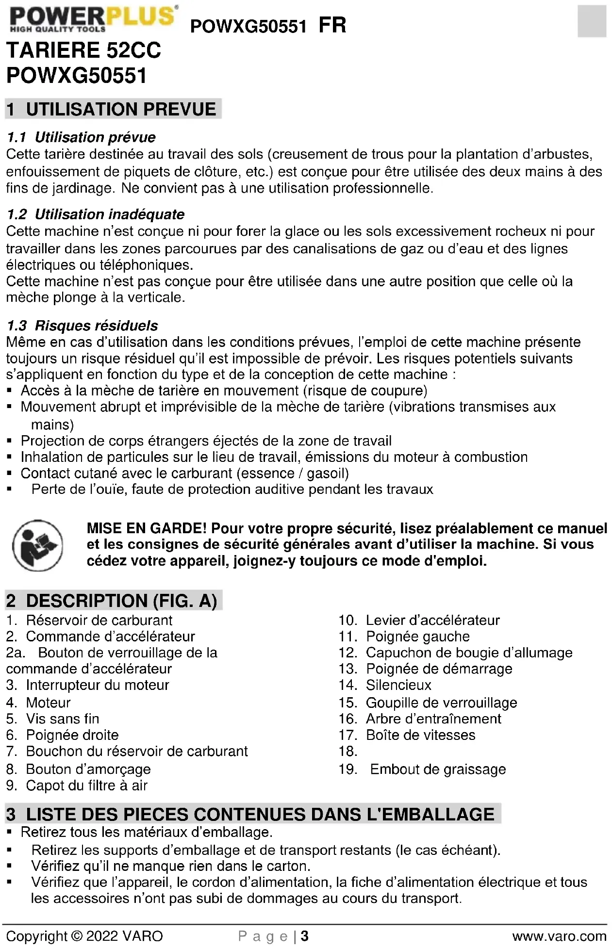 - Faites toujours attention à la façon dont vous utilisez l’outil. Un contact avec la vis sans fin en rotation peut entraîner des blessures graves. AVERTISSEMENT ! N’utilisez jamais la vis sans fin avec les deux mains au- dessus du niveau de la taille. Dans le cas contraire, la maîtrise de l’outil est limitée et cela peut entraîner des blessures graves à la poitrine si l’outil heurte un objet dur.POWXG50551 FR Copyright © 2022 VARO P a g e | 9 www.varo.com