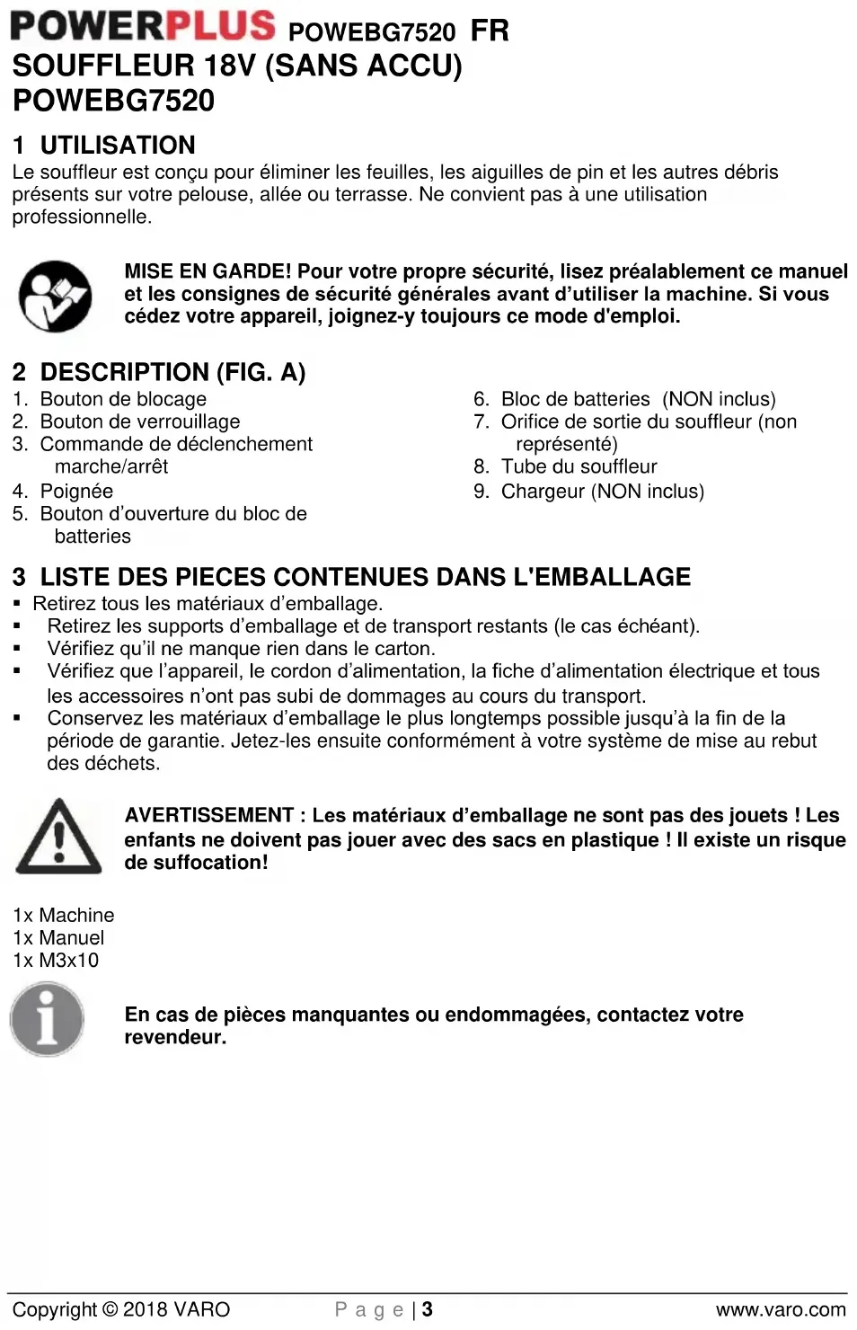 Copyright © 2018 VARO P a g e | 3 www.varo.com SOUFFLEUR 18V (SANS ACCU) POWEBG7520 1 UTILISATION Le souffleur est conçu pour éliminer les feuilles, les aiguilles de pin et les autres débris présents sur votre pelouse, allée ou terrasse. Ne convient pas à une utilisation professionnelle. MISE EN GARDE! Pour votre propre sécurité, lisez préalablement ce manuel et les consignes de sécurité générales avant d’utiliser la machine. Si vous cédez votre appareil, joignez-y toujours ce mode d'emploi. 2 DESCRIPTION (FIG. A)