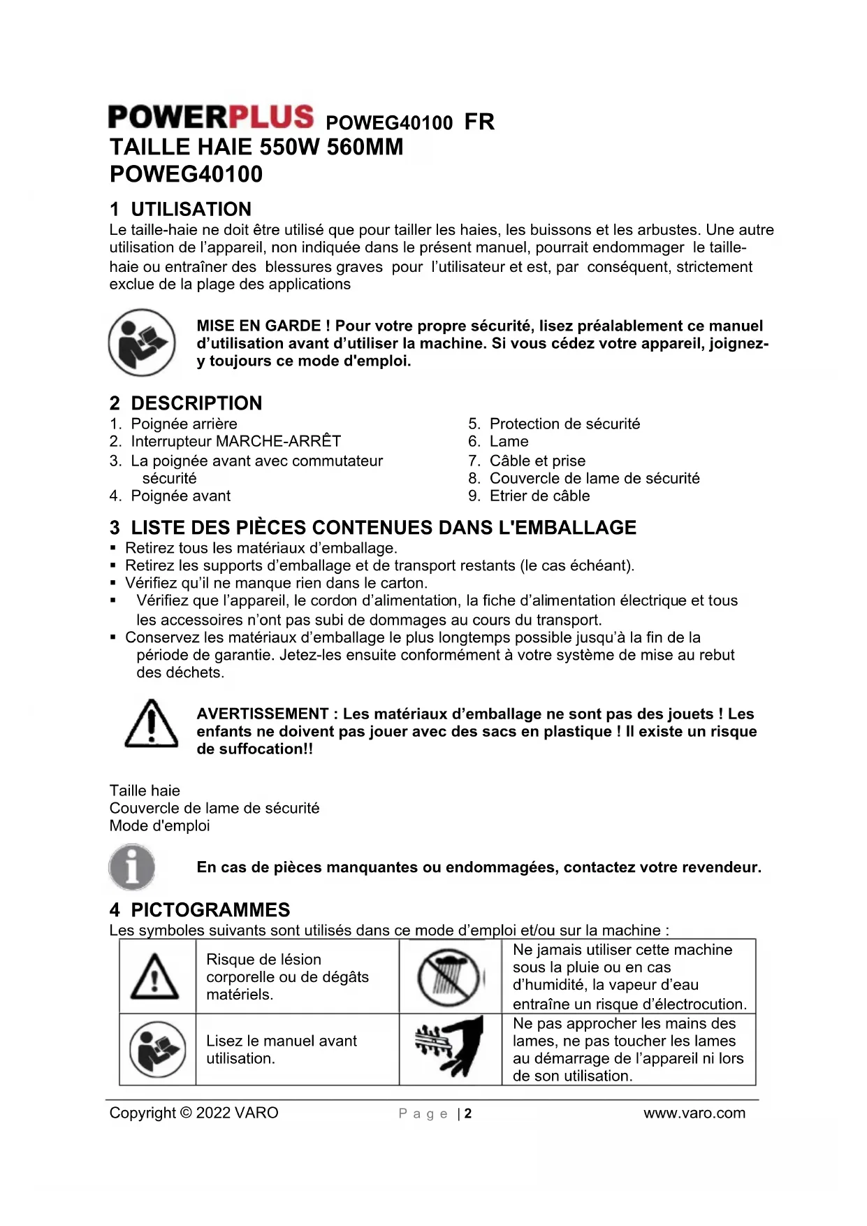 Ne pas approcher les mains des lames, ne pas toucher les lames au démarrage de l’appareil ni lors de son utilisation.POWEG40100 FR Copyright © 2022 VARO P a g e | 3 www.varo.com