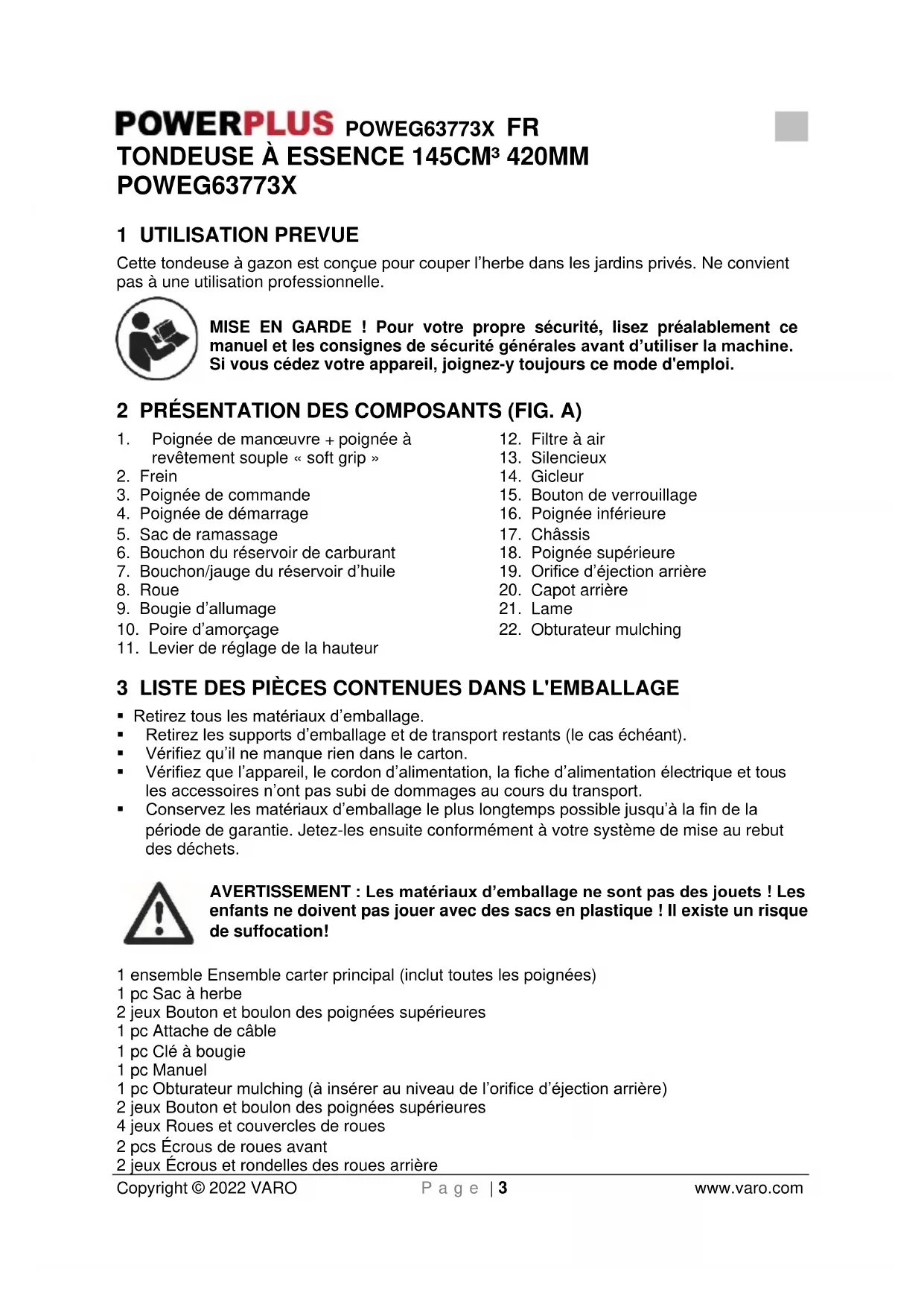 enfants ne doivent pas jouer avec des sacs en plastique ! Il existe un risque de suffocation! 1 ensemble Ensemble carter principal (inclut toutes les poignées) 1 pc Sac à herbe 2 jeux Bouton et boulon des poignées supérieures 1 pc Attache de câble 1 pc Clé à bougie 1 pc Manuel 1 pc Obturateur mulching (à insérer au niveau de l’orifice d’éjection arrière) 2 jeux Bouton et boulon des poignées supérieures 4 jeux Roues et couvercles de roues 2 pcs Écrous de roues avant 2 jeux Écrous et rondelles des roues arrièrePOWEG63773X FR Copyright © 2022 VARO P a g e | 4 www.varo.com 1 pc Clé de fixation de roues 1 pc Guide câble En cas de pièces manquantes ou endommagées, contactez votre revendeur. 4 PICTOGRAMMES Les symboles suivants sont utilisés dans ce mode d’emploi et/ou sur la machine:
