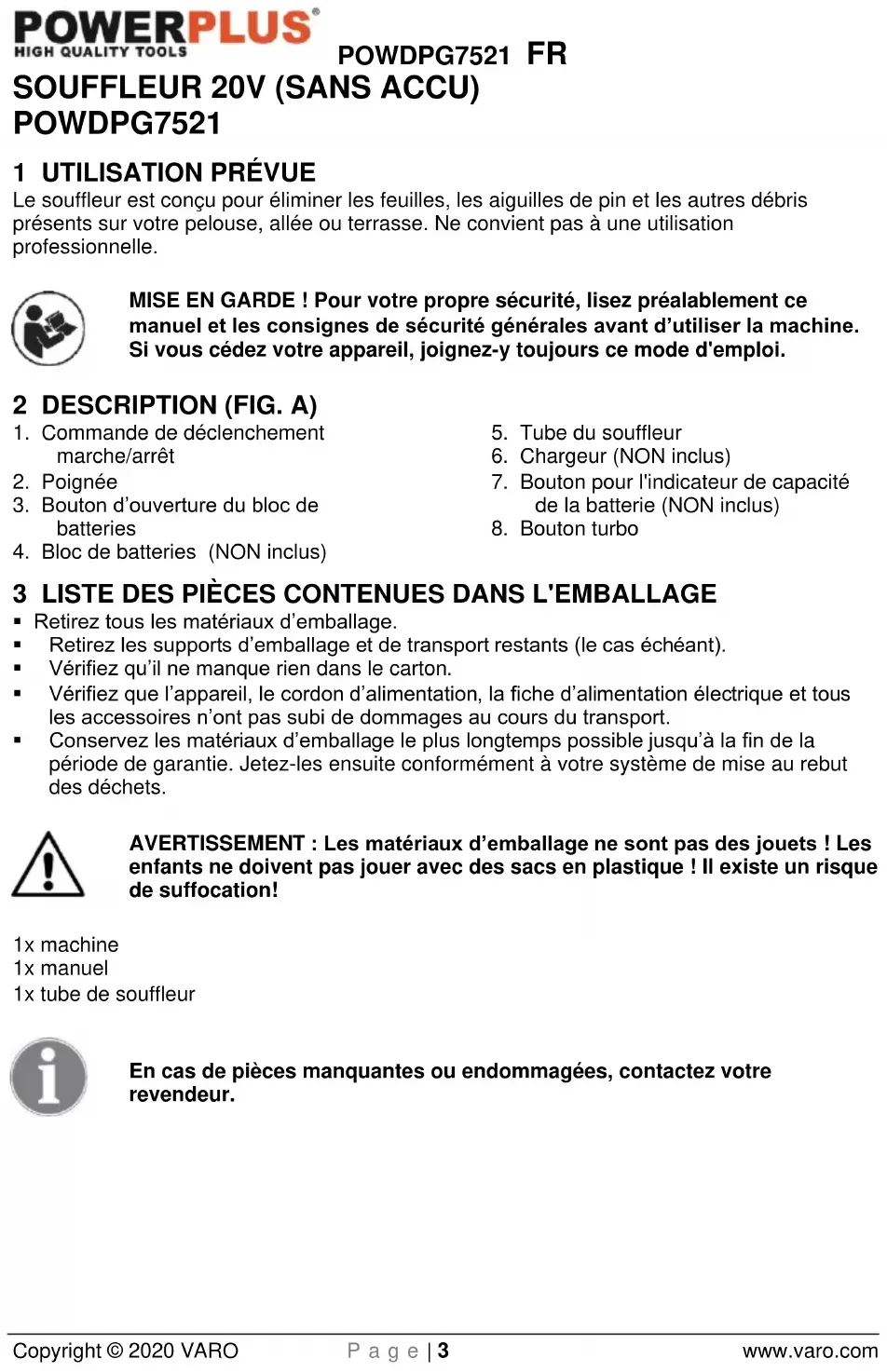- Les avertissements, précautions et instructions contenues dans le présent manuel d'utilisation ne visent pas à couvrir toutes les conditions et situations susceptibles de survenir. L'utilisateur doit faire preuve de sens pratique et prendre les précautions qui s'imposent lors de l'installation, de l'utilisation et de l'entretien de l'appareil.POWDPG7521 FR Copyright © 2020 VARO P a g e | 7 www.varo.com 7 CONSIGNES DE SÉCURITÉ SUPPLÉMENTAIRES POUR LES