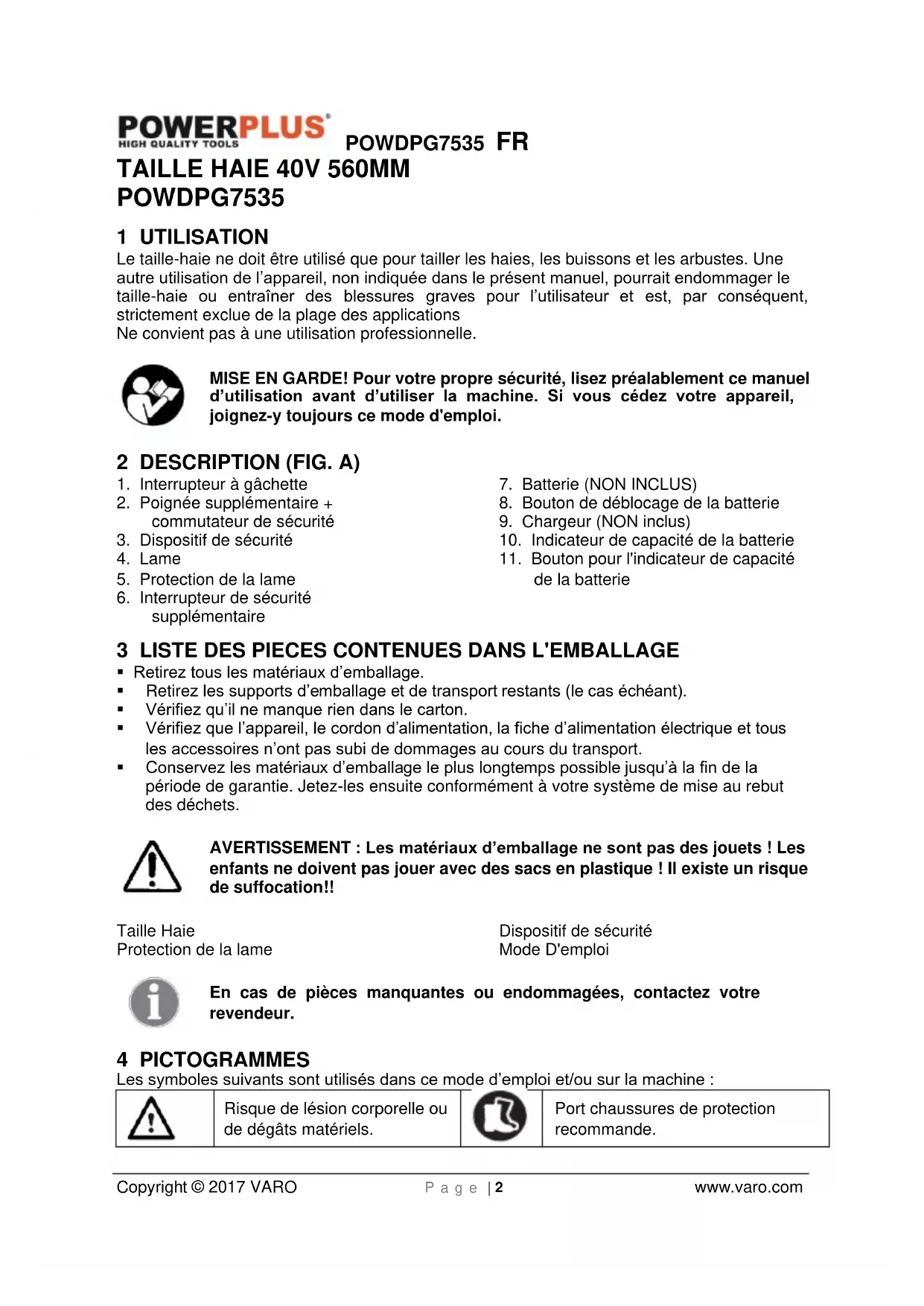 Vérifiez régulièrement votre machine avant de commencer le travail. Les lames de coupe endommagées doivent être réparées ou remplacées par une personne qualifiée avant d’utiliser la machine. Après chaque opération de coupe, nettoyez la lame de coupe à l’aide d’une brosse douce et d’un chiffon et d’une huile liquide de graissage et vaporisez une fine couche d’huile de protection liquide sur l’ensemble de la lame. Maintenez toujours propres les orifices de ventilation du carter moteur. Ne nettoyez jamais une machine avec de l’eau et n’en vaporisez jamais dessus. Nettoyez le carter moteur uniquement à l’aide d’un chiffon humide et n’appliquez jamais de détergents ni de solvants. Ces derniers pourraient endommager de manière irréversible les pièces en plastique de la machine. Pour finir, séchez bien le carter moteur. Remisez la machine recouverte du capot de protection fourni. Utilisez uniquement des accessoires et pièces de rechange d’origine. 11 SPECIFICATIONS TECHNIQUES Type POWDPG7535 Alimentation 40V Longueur de lame 560 mm Longueur de découpage 540 mm Capacité de coupe 18 mm Vitesse à vide 1550 /min 12 BRUIT Valeurs des émissions acoustiques mesurées selon la norme applicable. (K=3) Pression acoustique LpA 87 dB(A) Puissance acoustique LwA 98 dB(A) ATTENTION ! Lorsque la pression acoustique dépasse la valeur de 85 dB(A), il est nécessaire de porter des dispositifs individuels de protection de l’ouïe. aw (Vibrations): 3,1 m/s² K = 1,5 m/s² 13 GARANTIE Ce produit est garanti pour une période de 36 mois effective à compter de la date d’achat par le premier utilisateur. Cette garantie couvre toutes les défaillances matérielles ou les défauts de fabrication, elle n’inclut pas : les batteries, les chargeurs, les défauts dus à l’usure normale des pièces, telles que les roulements, brosses, câbles, fiches ou les accessoires tels que les foreuses, forets, lames de scie, etc. ; les dommages ou les défauts résultant d’une utilisation incorrecte, d’accidents ou de modifications ; ni ne couvre les frais de transport. Les dommages et/ou les défauts résultant d'une utilisation incorrecte n'entrent pas non plus dans les clauses de garantie.POWDPG7535 FR Copyright © 2017 VARO P a g e | 9 www.varo.com Nous rejetons toute responsabilité pour toute blessure corporelle résultant d'une utilisation inappropriée de l'outil. Les réparations ne peuvent être réalisées que par un service après-vente agréé pour les outils Powerplus. Vous pouvez obtenir davantage d'informations au numéro 00 32 3 292 92 90. Tous les frais de transport doivent toujours être supportés par le client, sauf indication contraire écrite. De plus, aucune réclamation ne peut être émise dans le cadre de la garantie si l'endommagement de l'appareil résulte d'une négligence d'entretien ou d'une surcharge. Tout dommage résultant d'une pénétration de fluide, d'une pénétration d'une grande quantité de poussière, d'un endommagement volontaire (délibérément ou par grave négligence), d'une utilisation inappropriée (utilisations pour lesquelles l'appareil n'est pas adapté), d'une utilisation incorrecte (par exemple, non respect des consignes indiquées dans le manuel), d'un montage incorrect, de la foudre, d'une tension incorrecte, n'entre pas dans la garantie. Cette liste n'est pas restrictive. L'acceptation des réclamations sous garantie ne peut en aucun cas entraîner la prolongation de la période de garantie ni le début d'une nouvelle période de garantie en cas de remplacement de l'appareil. Les appareils ou pièces remplacé(e)s sous garantie sont par conséquent la propriété de Varo NV. Nous nous réservons le droit de rejeter toute réclamation dans les cas ou l’achat ne peut être vérifié ni lorsqu’il est évident que le produit n’a pas été correctement entretenu. (nettoyage des orifices de ventilation, entretien régulier des balais de charbon, etc.) Votre reçu d’achat doit être conservé comme preuve de la date d’achat. Votre outil non démonté doit être renvoyé à votre revendeur dans un état de propreté acceptable, (dans son coffret moulé par soufflage d’origine le cas échéant), accompagné de votre preuve d’achat. Votre outil doit être chargé au moins 1 fois par mois afin de garantir un fonctionnement optimal de cet outil. 14 ENVIRONNEMENT Si, après un certain temps, vous décidez de remplacer votre machine, ne vous en débarrassez pas avec les ordures ménagères mais destinez-la à un traitement respectueux de l'environnement. Les déchets électriques ne peuvent être traités de la même manière que les ordures ménagères ordinaires. Procédez à leur recyclage, là où il existe des installations adéquates. Renseignez-vous à propos des procédés de collecte et de traitement auprès des autorités locales compétentes ou de votre revendeur.POWDPG7535 FR Copyright © 2017 VARO P a g e | 10 www.varo.com