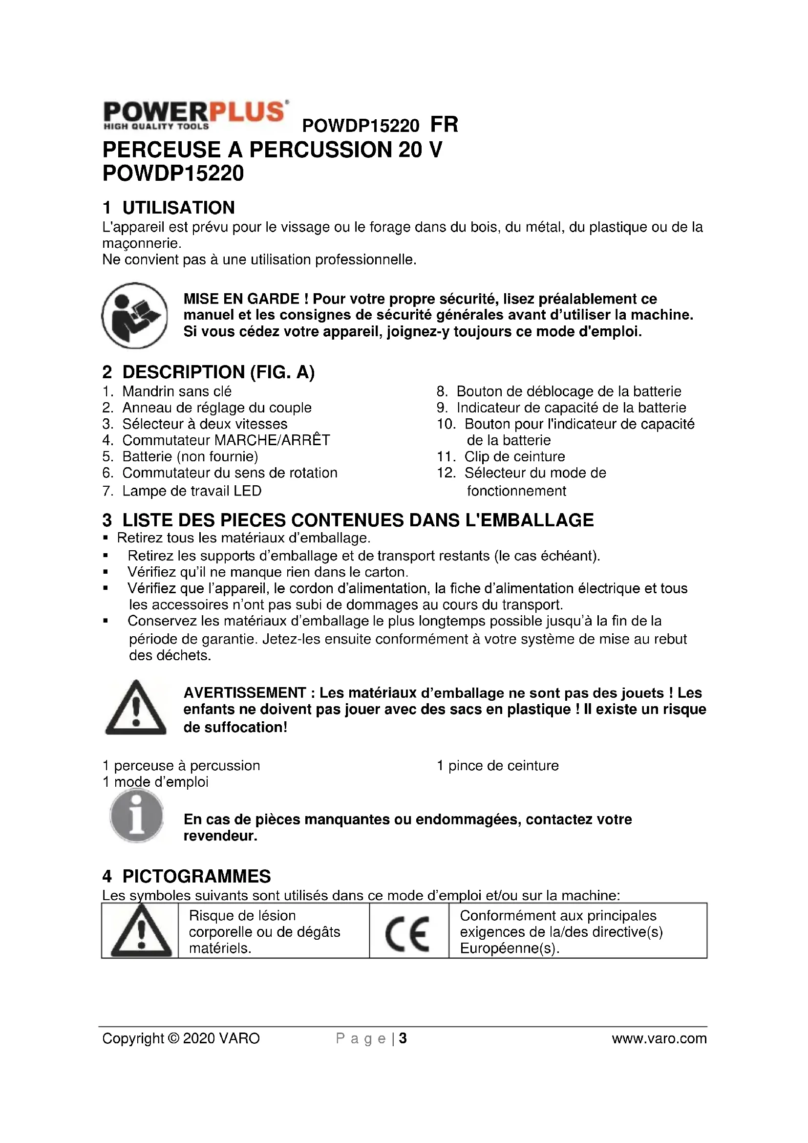 VARO – Vic. Van Rompuy N.V. - Joseph Van Instraat 9 - BE2500 Lier - BELGIQUE, déclare que: appareil : Perceuse à percussion 20 V marque : PowerPlus modèle : POWDP15220 est en conformité avec les exigences essentielles et les autres dispositions pertinentes des Directives européennes applicables, basées sur l'application des normes européennes harmonisées. Toute modification non autorisée de l'appareil annule cette déclaration. Directives européennes (y compris, le cas échéant, leurs amendements à la date de la signature) : 2011/65/EU 2006/42/EC 2014/30/EU Normes européennes harmonisées (y compris, le cas échéant, leurs amendements à la date de la signature) : EN62841-1 : 2015 EN62841-2-1 : 2018 EN55014-1 : 2017 EN55014-2 : 2015 Détenteur de la Documentation technique : Philippe Vankerkhove, VARO – Vic. Van Rompuy N.V. Le soussigné agit au nom du PDG de l'entreprise, Ludo Mertens Réglementation – Directeur de la conformité 11/08/2020, Lier - BelgiumPOWDP15220 EN Copyright © 2020 VARO P a g e | 1 www.varo.com 1 APPLICATION ................................................................................ 3