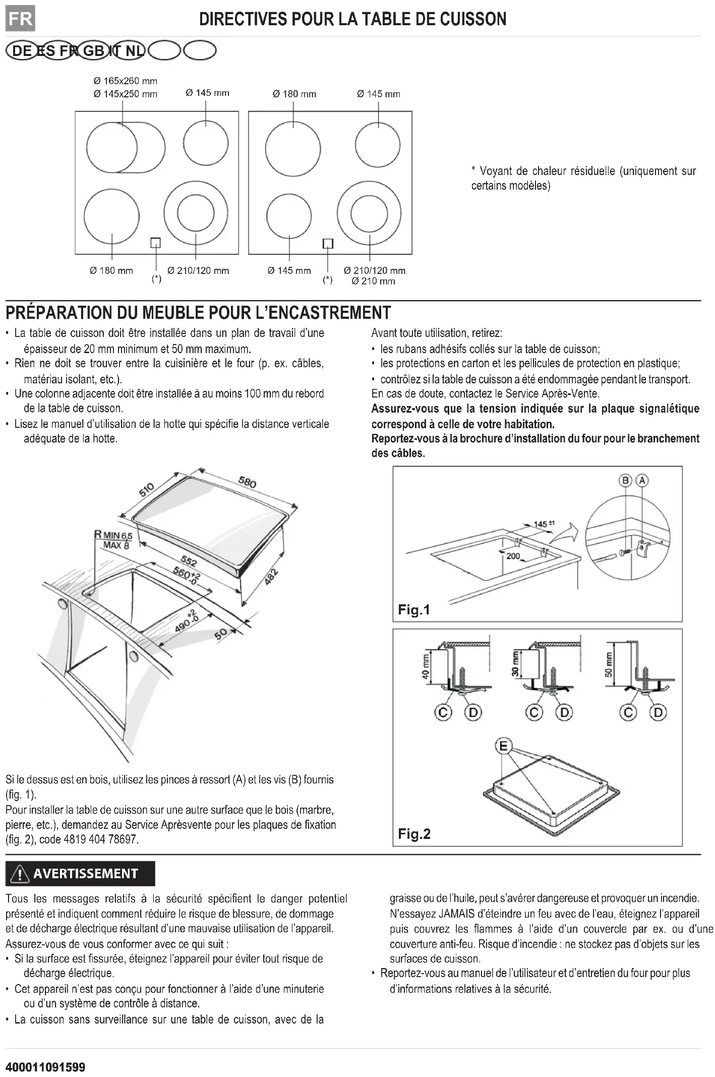 - contrôlez si la table de cuisson a été endommagée pendant le transport. En cas de doute, contactez le Service Après-Vente. Assurez-vous que la tension indiquée sur la plaque signalétique correspond à celle de votre habitation. Reportez-vous à la brochure d’installation du four pour le branchement des câbles. Fig. 2 Fig. 1 Si le dessus est en bois, utilisez les pinces à ressort (A) et les vis (B) fournis (g. 1). Pour installer la table de cuisson sur une autre surface que le bois (marbre, pierre, etc.), demandez au Service Aprèsvente pour les plaques de xation (g. 2), code 4819 404 78697. Tous les messages relatifs à la sécurité spécient le danger potentiel présenté et indiquent comment réduire le risque de blessure, de dommage et de décharge électrique résultant d’une mauvaise utilisation de l’appareil. Assurez-vous de vous conformer avec ce qui suit :