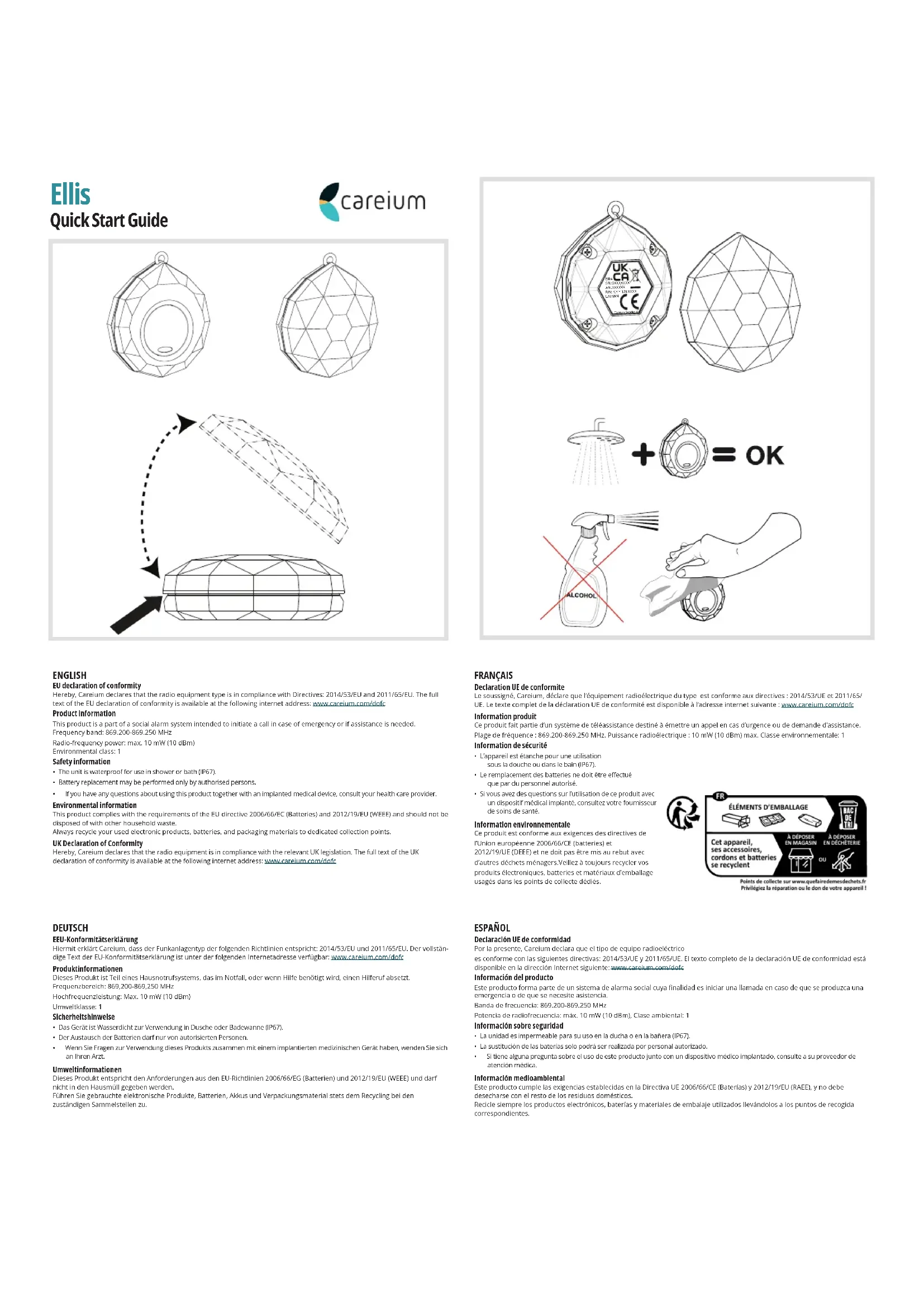 - If you have any questions about using this product together with an implanted medical device, consult your health care provider. Environmental information This product complies with the requirements of the EU directive 2006/66/EC (Batteries) and 2012/19/EU (WEEE) and should not be disposed of with other household waste.Always recycle your used electronic products, batteries, and packaging materials to dedicated collection points.UK Declaration of Conformity Hereby, Careium declares that the radio equipment is in compliance with the relevant UK legislation. The full text of the UK declaration of conformity is available at the following internet address: www.careium.com/dofc FRANÇAIS Declaration UE de conformite Le soussigné, Careium, déclare que l’équipement radioélectrique du type est conforme aux directives: 2014/53/UE et 2011/65/ UE. Le texte complet de la déclaration UE de conformité est disponible à l’adresse internet suivante:www.careium.com/dofc Information produit Ce produit fait partie d’un système de téléassistance destiné à émettre un appel en cas d’urgence ou de demande d’assistance. Plage de fréquence : 869.200-869.250MHz. Puissance radioélectrique : 10mW (10dBm) max. Classe environnementale: 1Information de sécurité• L’appareil est étanche pour une utilisation sous la douche ou dans le bain (IP67).• Le remplacement des batteries ne doit être eectué que par du personnel autorisé.• Si vous avez des questions sur l’utilisation de ce produit avec un dispositif médical implanté, consultez votre fournisseur de soins de santé.Information environnementaleCe produit est conforme aux exigences des directives del’Union européenne 2006/66/CE (batteries) et2012/19/UE (DEEE) et ne doit pas être mis au rebut avec d’autres déchets ménagers.Veillez à toujours recycler vos produits électroniques, batteries et matériaux d’emballageusagés dans les points de collecte dédiés. Points de collecte sur www.quefairedemesdechets.fr Privilégiez la réparation ou le don de votre appareil ! À DÉPOSEREN MAGASINÀ DÉPOSEREN DÉCHÈTERIEOU Cet appareil, ses accessoires, cordons et batteries se recyclent