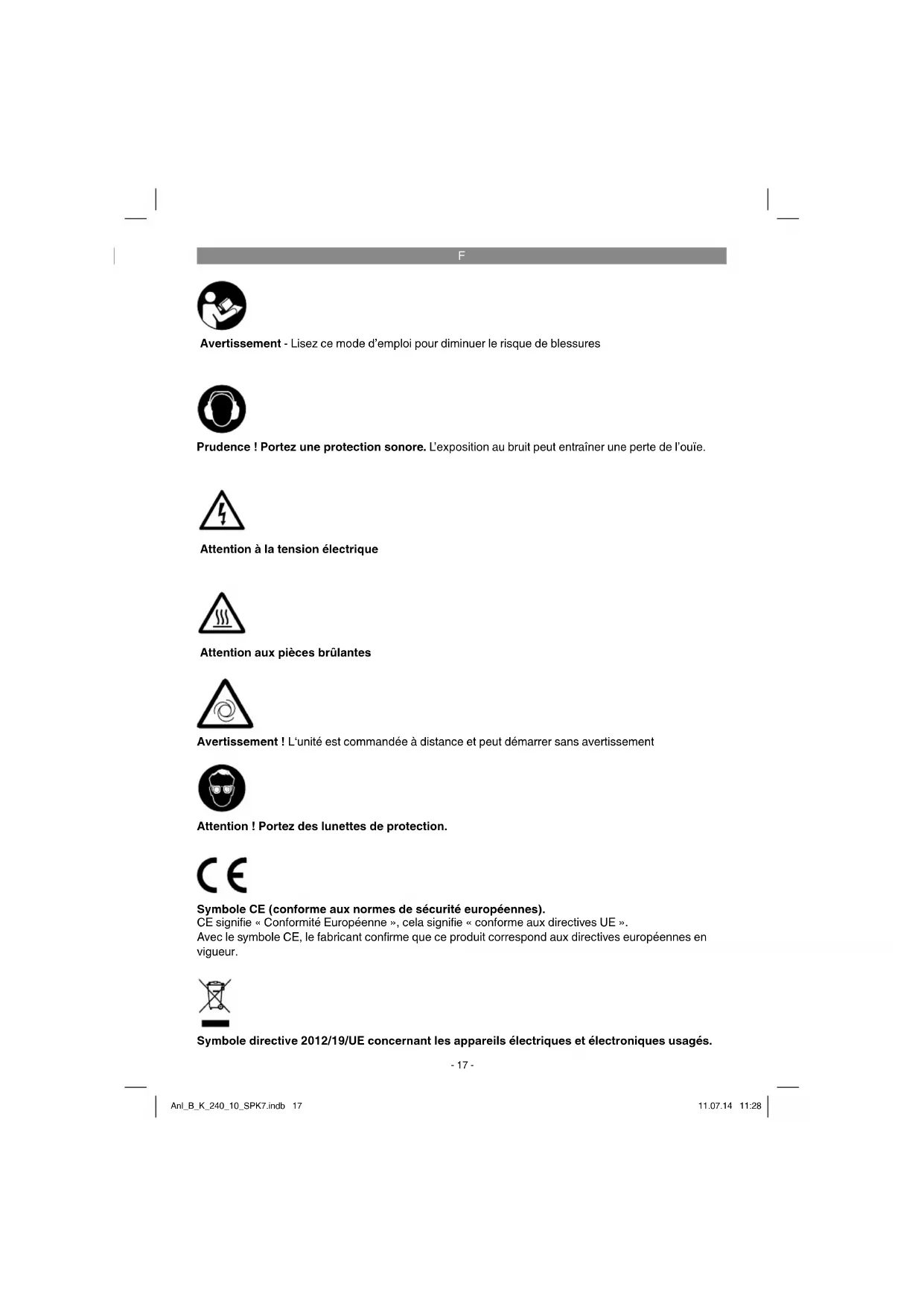 Avertissement - Lisez ce mode d’emploi pour diminuer le risque de blessures Prudence ! Portez une protection sonore. L’exposition au bruit peut entraîner une perte de l’ouïe. Attention aux pièces brûlantes Attention à la tension électrique Avertissement ! L‘unité est commandée à distance et peut démarrer sans avertissement Attention ! Portez des lunettes de protection. Symbole CE (conforme aux normes de sécurité européennes). CE signifi e « Conformité Européenne », cela signifi e « conforme aux directives UE ». Avec le symbole CE, le fabricant confi rme que ce produit correspond aux directives européennes en vigueur. Symbole directive 2012/19/UE concernant les appareils électriques et électroniques usagés. Anl_B_K_240_10_SPK7.indb 17Anl_B_K_240_10_SPK7.indb 17 11.07.14 11:2811.07.14 11:28F