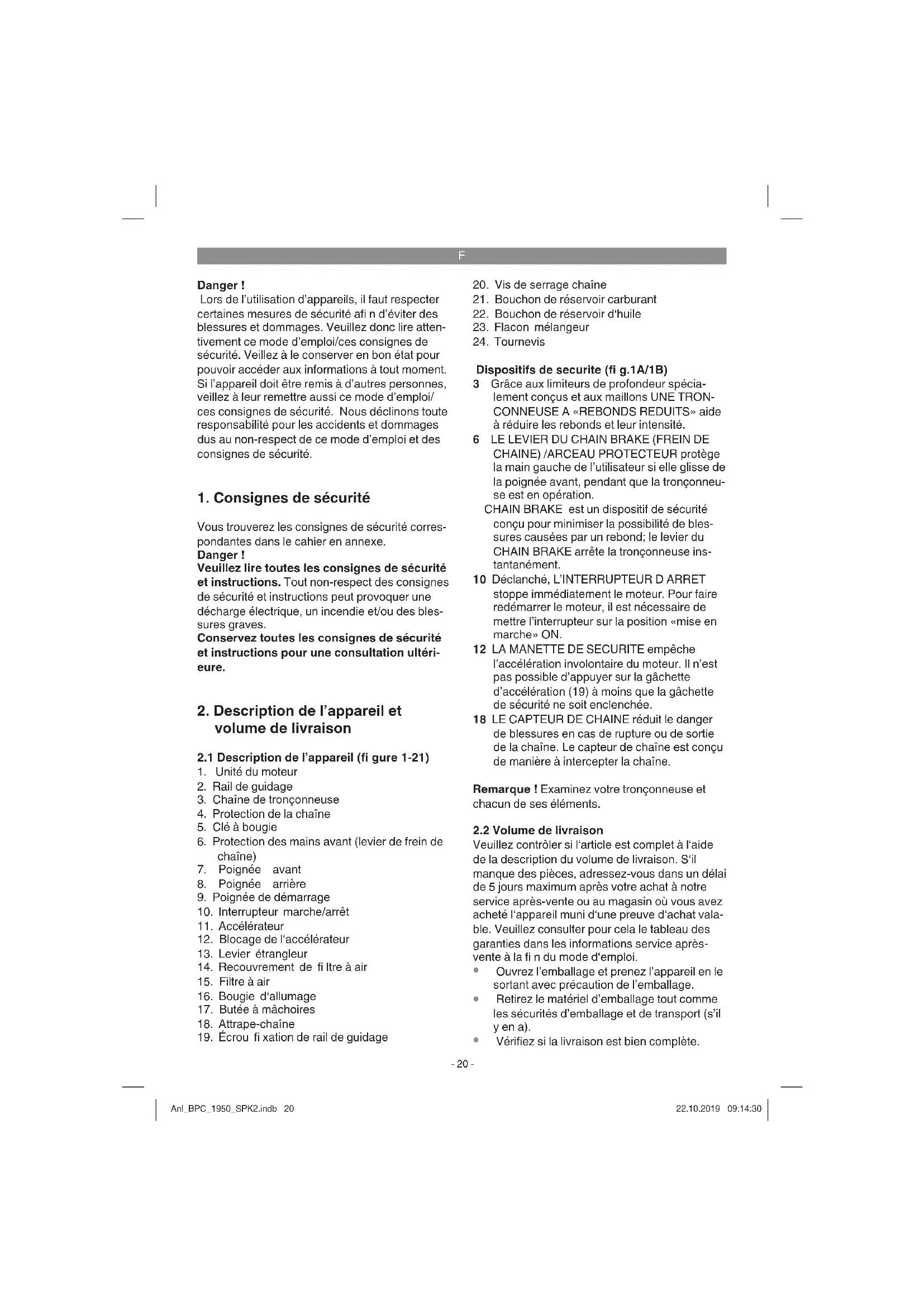 Carburant Pour une performance optimale, utiliser de l’essence ordinaire sans plomb mélangée à de l’huile spéciale 2 temps dans une proportion de 1:40. Melange du carburant Mélanger le carburant avec de l’huile 2 temps dans un récipient approprié. Agiter pour obtenir un mélange homogène. Anl_BPC_1950_SPK2.indb 22Anl_BPC_1950_SPK2.indb 22 22.10.2019 09:14:3022.10.2019 09:14:30F