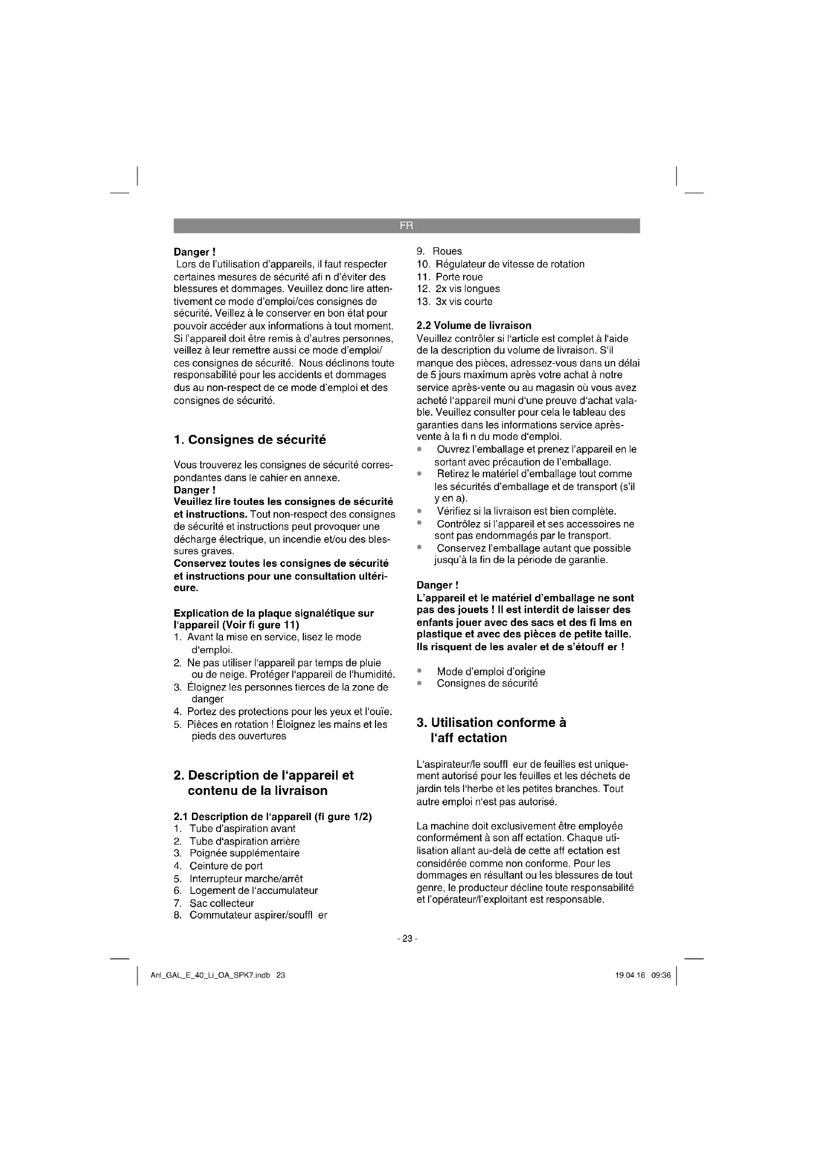 l‘aff ectation L‘aspirateur/le souffl eur de feuilles est unique- ment autorisé pour les feuilles et les déchets de jardin tels l‘herbe et les petites branches. Tout autre emploi n‘est pas autorisé. La machine doit exclusivement être employée conformément à son aff ectation. Chaque uti- lisation allant au-delà de cette aff ectation est considérée comme non conforme. Pour les dommages en résultant ou les blessures de tout genre, le producteur décline toute responsabilité et l’opérateur/l’exploitant est responsable. Anl_GAL_E_40_Li_OA_SPK7.indb 23Anl_GAL_E_40_Li_OA_SPK7.indb 23 19.04.16 09:3619.04.16 09:36FR