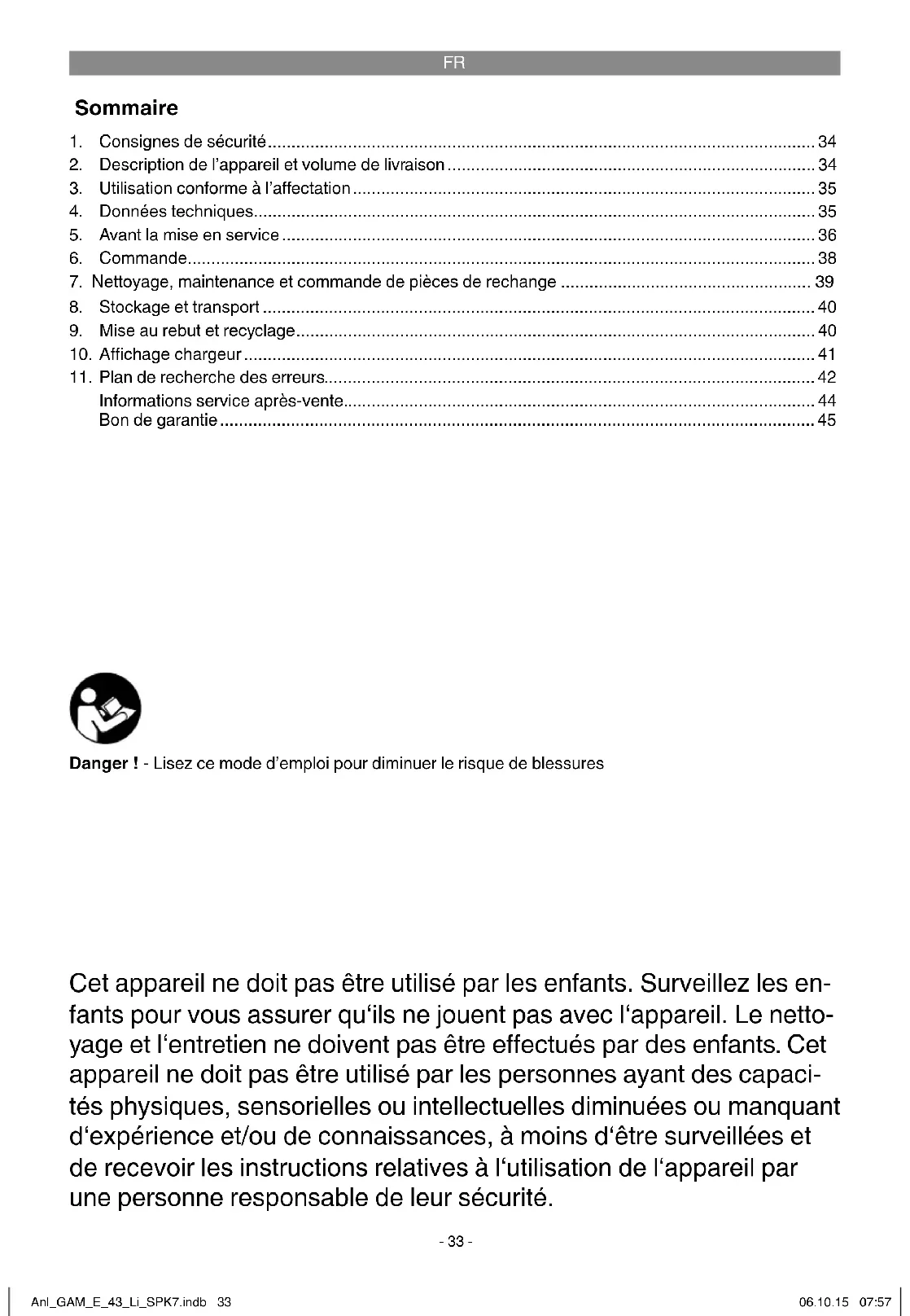 - Sommaire Cet appareil ne doit pas être utilisé par les enfants. Surveillez les en- fants pour vous assurer qu‘ils ne jouent pas avec l‘appareil. Le netto- yage et l‘entretien ne doivent pas être eff ectués par des enfants. Cet appareil ne doit pas être utilisé par les personnes ayant des capaci- tés physiques, sensorielles ou intellectuelles diminuées ou manquant d‘expérience et/ou de connaissances, à moins d‘être surveillées et de recevoir les instructions relatives à l‘utilisation de l‘appareil par une personne responsable de leur sécurité. 1. Consignes de sécurité p. 34