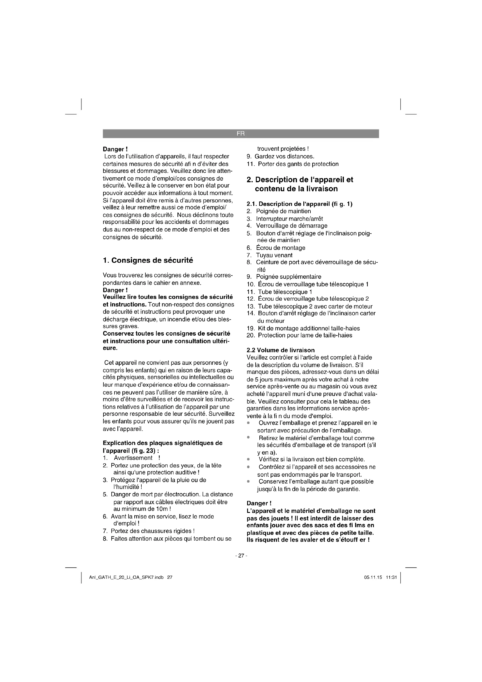 Conservez l’emballage autant que possible jusqu’à la fin de la période de garantie. Danger ! L’appareil et le matériel d’emballage ne sont pas des jouets ! Il est interdit de laisser des enfants jouer avec des sacs et des fi lms en plastique et avec des pièces de petite taille. Ils risquent de les avaler et de s’étouff er ! Anl_GATH_E_20_Li_OA_SPK7.indb 27Anl_GATH_E_20_Li_OA_SPK7.indb 27 05.11.15 11:3105.11.15 11:31FR