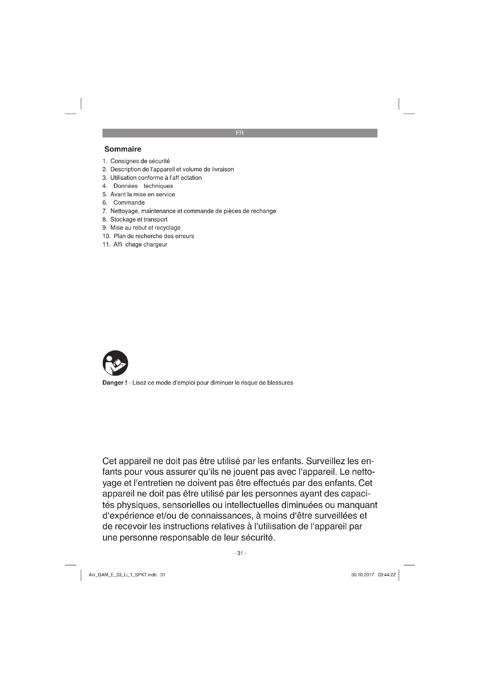 Cet appareil ne doit pas être utilisé par les enfants. Surveillez les en- fants pour vous assurer qu‘ils ne jouent pas avec l‘appareil. Le netto- yage et l‘entretien ne doivent pas être eff ectués par des enfants. Cet appareil ne doit pas être utilisé par les personnes ayant des capaci- tés physiques, sensorielles ou intellectuelles diminuées ou manquant d‘expérience et/ou de connaissances, à moins d‘être surveillées et de recevoir les instructions relatives à l‘utilisation de l‘appareil par une personne responsable de leur sécurité. Danger ! - Lisez ce mode d’emploi pour diminuer le risque de blessures Anl_GAM_E_33_Li_1_SPK7.indb 31Anl_GAM_E_33_Li_1_SPK7.indb 31 30.10.2017 09:44:2230.10.2017 09:44:22FR