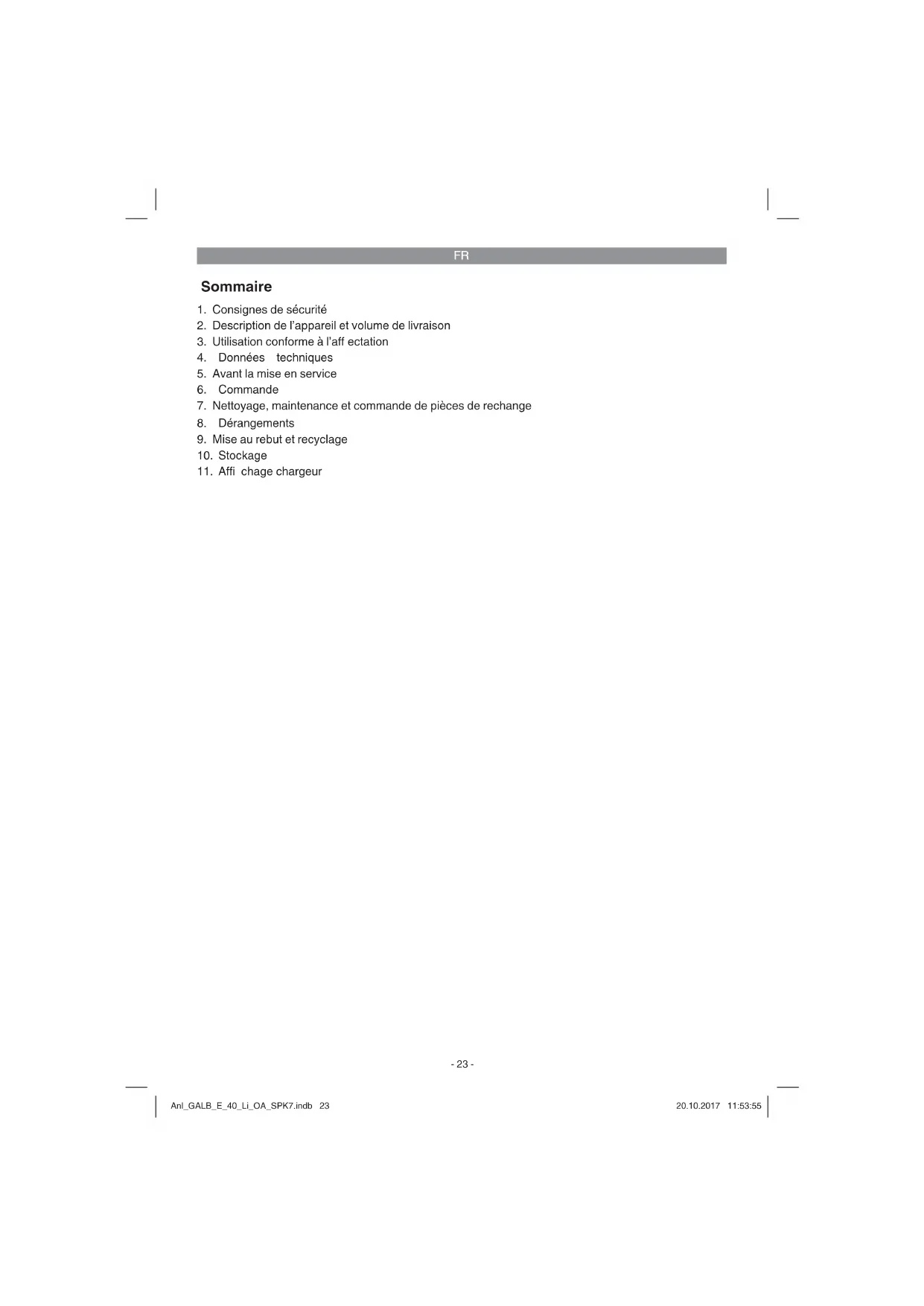 Uniquement pour les pays de l’Union Européenne Ne jetez pas les outils électriques dans les ordures ménagères! Selon la norme européenne 2012/19/CE relative aux appareils électriques et systèmes électroniques usés et selon son application dans le droit national, les outils électriques usés doivent être récoltés à part et apportés à un recyclage respectueux de l’environnement. Possibilité de recyclage en alternative à la demande de renvoi : Le propriétaire de l’appareil électrique est obligé, en guise d’alternative à un envoi en retour, à contribu- er à un recyclage eff ectué dans les règles de l’art en cas de cessation de la propriété. L’ancien appareil peut être remis à un point de collecte dans ce but. Cet organisme devra l’éliminer dans le sens de la Loi sur le cycle des matières et les déchets. Ne sont pas concernés les accessoires et ressources fournies sans composants électroniques. Toute réimpression ou autre reproduction de la documentation et des papiers joints aux produits, même sous forme d’extraits, est uniquement permise une fois l’accord explicite de l’ISC GmbH obtenu. Sous réserve de modifi cations techniques Anl_GALB_E_40_Li_OA_SPK7.indb 29Anl_GALB_E_40_Li_OA_SPK7.indb 29 20.10.2017 11:53:5520.10.2017 11:53:55FR