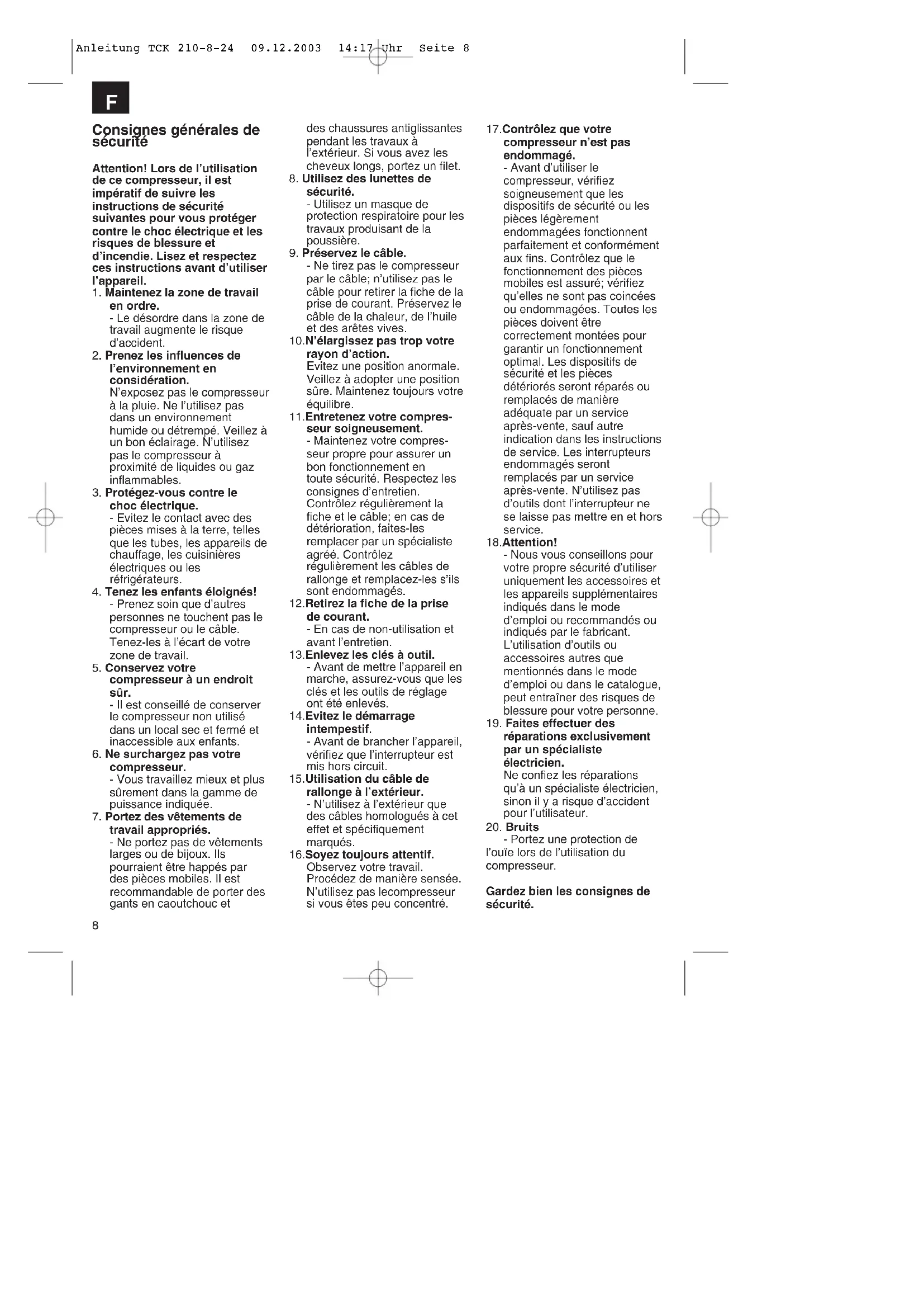 Anleitung TCK 210-8-24 09.12.2003 14:17 Uhr Seite 78 Consignes générales de sécurité Attention! Lors de l’utilisation de ce compresseur, il est impératif de suivre les instructions de sécurité suivantes pour vous protéger contre le choc électrique et les risques de blessure et d’incendie. Lisez et respectez ces instructions avant d’utiliser l’appareil.