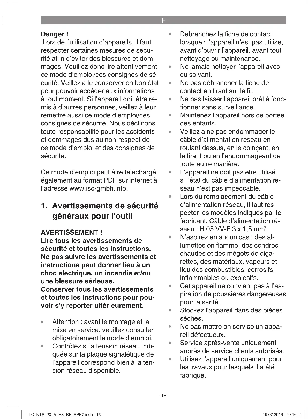 Uniquement pour les pays de l’Union Européenne Ne jetez pas les outils électriques dans les ordures ménagères! Selon la norme européenne 2012/19/CE relative aux appareils électriques et sys- tèmes électroniques usés et selon son application dans le droit national, les outils électriques usés doivent être récoltés à part et apportés à un recyclage respec- tueux de l’environnement. Possibilité de recyclage en alternative à la demande de renvoi : Le propriétaire de l’appareil électrique est obligé, en guise d’alternative à un envoi en retour, à contribuer à un recyclage eff ectué dans les règles de l’art en cas de cessation de la propriété. L’ancien appareil peut être remis à un point de collecte dans ce but. Cet organisme devra l’éliminer dans le sens de la Loi sur le cycle des matières et les déchets. Ne sont pas concernés les accessoires et ressources four- nies sans composants électroniques. Toute réimpression ou autre reproduction de la documentation et des papiers joints aux produits, même sous forme d’extraits, est uniquement permise une fois l’ac- cord explicite de l’ISC GmbH obtenu. Sous réserve de modifi cations techniques TC_NTS_20_A_EX_BE_SPK7.indb 22TC_NTS_20_A_EX_BE_SPK7.indb 22 19.07.2016 09:16:4119.07.2016 09:16:41F