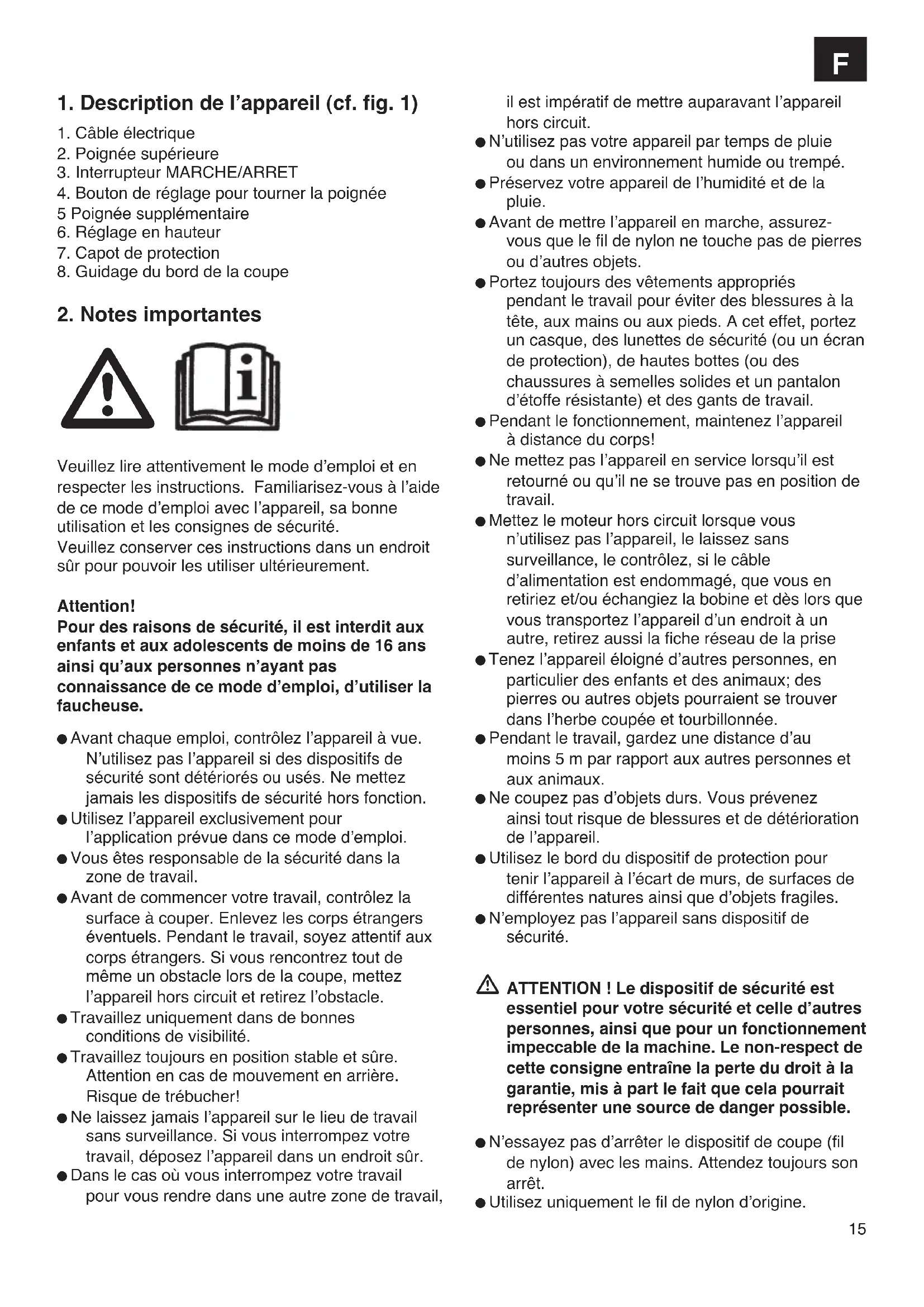 Veuillez lire attentivement le mode d’emploi et en respecter les instructions. Familiarisez-vous à l’aide de ce mode d’emploi avec l’appareil, sa bonne utilisation et les consignes de sécurité. Veuillez conserver ces instructions dans un endroit sûr pour pouvoir les utiliser ultérieurement. Attention! Pour des raisons de sécurité, il est interdit aux enfants et aux adolescents de moins de 16 ans ainsi qu’aux personnes n’ayant pas connaissance de ce mode d’emploi, d’utiliser la faucheuse. Avant chaque emploi, contrôlez l’appareil à vue. N’utilisez pas l’appareil si des dispositifs de sécurité sont détériorés ou usés. Ne mettez jamais les dispositifs de sécurité hors fonction. Utilisez l’appareil exclusivement pour l’application prévue dans ce mode d’emploi. Vous êtes responsable de la sécurité dans la zone de travail. Avant de commencer votre travail, contrôlez la surface à couper. Enlevez les corps étrangers éventuels. Pendant le travail, soyez attentif aux corps étrangers. Si vous rencontrez tout de même un obstacle lors de la coupe, mettez l’appareil hors circuit et retirez l’obstacle. Travaillez uniquement dans de bonnes conditions de visibilité. Travaillez toujours en position stable et sûre. Attention en cas de mouvement en arrière. Risque de trébucher! Ne laissez jamais l’appareil sur le lieu de travail sans surveillance. Si vous interrompez votre travail, déposez l’appareil dans un endroit sûr. Dans le cas où vous interrompez votre travail pour vous rendre dans une autre zone de travail, il est impératif de mettre auparavant l’appareil hors circuit. N’utilisez pas votre appareil par temps de pluie ou dans un environnement humide ou trempé. Préservez votre appareil de l’humidité et de la pluie. Avant de mettre l’appareil en marche, assurez- vous que le fil de nylon ne touche pas de pierres ou d’autres objets. Portez toujours des vêtements appropriés pendant le travail pour éviter des blessures à la tête, aux mains ou aux pieds. A cet effet, portez un casque, des lunettes de sécurité (ou un écran de protection), de hautes bottes (ou des chaussures à semelles solides et un pantalon d’étoffe résistante) et des gants de travail. Pendant le fonctionnement, maintenez l’appareil à distance du corps! Ne mettez pas l’appareil en service lorsqu’il est retourné ou qu’il ne se trouve pas en position de travail. Mettez le moteur hors circuit lorsque vous n’utilisez pas l’appareil, le laissez sans surveillance, le contrôlez, si le câble d’alimentation est endommagé, que vous en retiriez et/ou échangiez la bobine et dès lors que vous transportez l’appareil d’un endroit à un autre, retirez aussi la fiche réseau de la prise Tenez l’appareil éloigné d’autres personnes, en particulier des enfants et des animaux; des pierres ou autres objets pourraient se trouver dans l’herbe coupée et tourbillonnée. Pendant le travail, gardez une distance d’au moins 5 m par rapport aux autres personnes et aux animaux. Ne coupez pas d’objets durs. Vous prévenez ainsi tout risque de blessures et de détérioration de l’appareil. Utilisez le bord du dispositif de protection pour tenir l’appareil à l’écart de murs, de surfaces de différentes natures ainsi que d’objets fragiles. N’employez pas l’appareil sans dispositif de sécurité. ATTENTION ! Le dispositif de sécurité est essentiel pour votre sécurité et celle d’autres personnes, ainsi que pour un fonctionnement impeccable de la machine. Le non-respect de cette consigne entraîne la perte du droit à la garantie, mis à part le fait que cela pourrait représenter une source de danger possible. N’essayez pas d’arrêter le dispositif de coupe (fil de nylon) avec les mains. Attendez toujours son arrêt. Utilisez uniquement le fil de nylon d’origine. F16 N’employez en aucun cas des fils métalliques à la place du fil de nylon. Faites attention à ne pas vous blesser sur le dispositif qui sert à découper la longueur de fil. Veillez à ce que les ouvertures d’air ne soient pas salies. Après l’emploi, retirez la fiche de la prise de courant et vérifiez que l’appareil ne présente pas de détériorations. Ne tentez pas de couper de l’herbe qui ne pousse pas sur le sol. Ne coupez pas d’herbe par exemple, poussant sur les murs ou sur les pierres etc. Dans la zone de travail de la faucheuse, l’utilisateur est responsable, vis-à-vis de tiers, des dommages causés par l’emploi de l’appareil. Ne traversez pas de routes ou de chemins caillouteux avec un appareil en marche. Lorsque vous n’utilisez pas l’appareil, gardez-le dans un endroit sec et inaccessible aux enfants. Utilisez l’appareil uniquement selon les descriptions du mode d’emploi et maintenez-le toujours verticalement par rapport au sol. Toute autre position est dangereuse. Vérifiez régulièrement si les vis sont bien serrées. La tension de secteur doit être identique à celle indiquée sur la plaque signalétique. Contrôlez régulièrement le câble de raccordement quant à des signes d’endommagement ou d’altération. N’utilisez l’appareil que si le câble de raccordement est en parfait état. Les câbles de raccordement utilisés ne doivent pas être plus légers que des conduites en tuyau flexible légères HO7RN-F conformément à la norme DIN 57282/VDE 0282 - ils doivent disposer d’un diamètre minimal de 1,5 mm