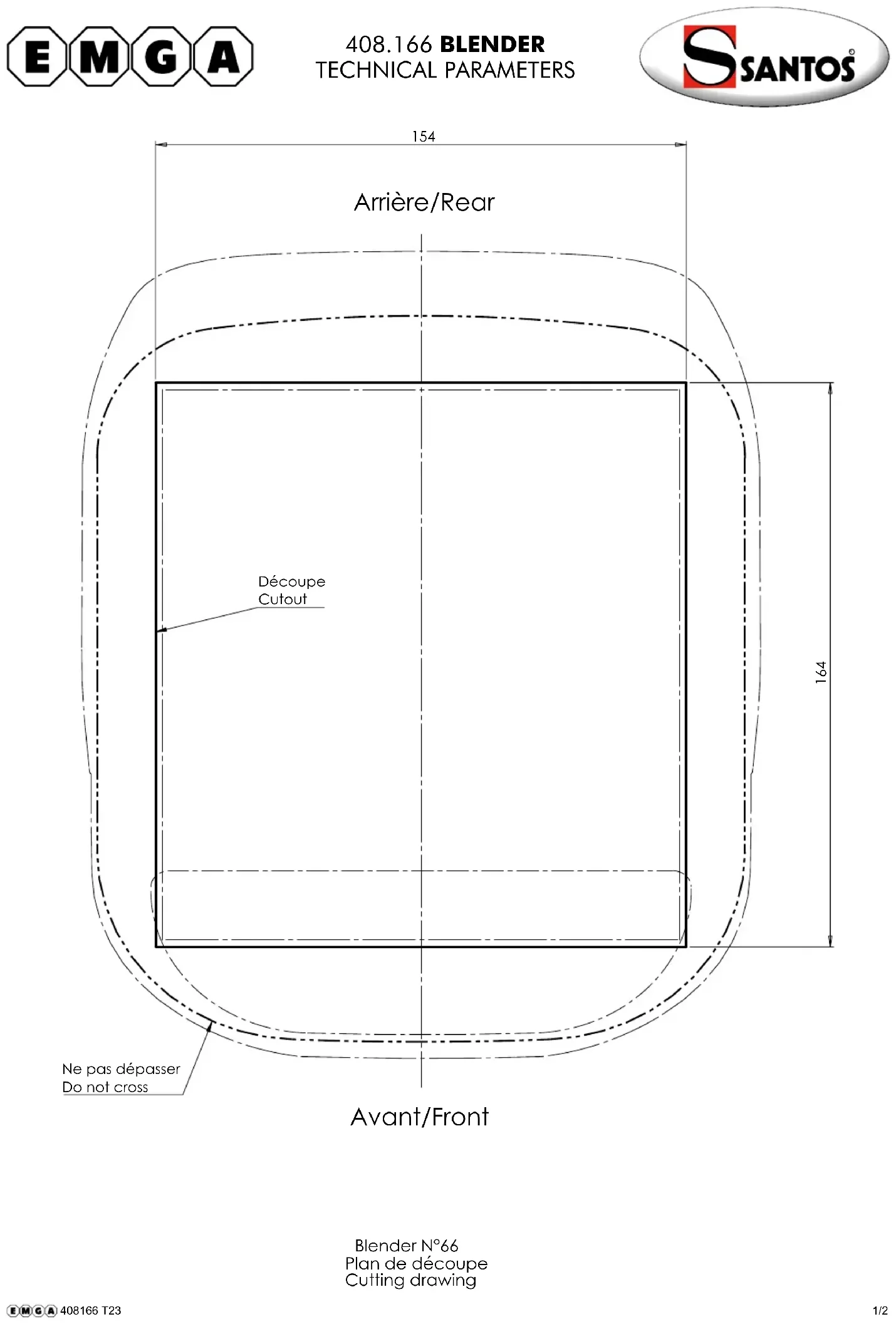 Découpe Cutout Ne pas dépasser Do not cross Avant/Front Arrière/Rear Blender N°66 Plan de découpe Cutting drawing 408166 T23 1/2